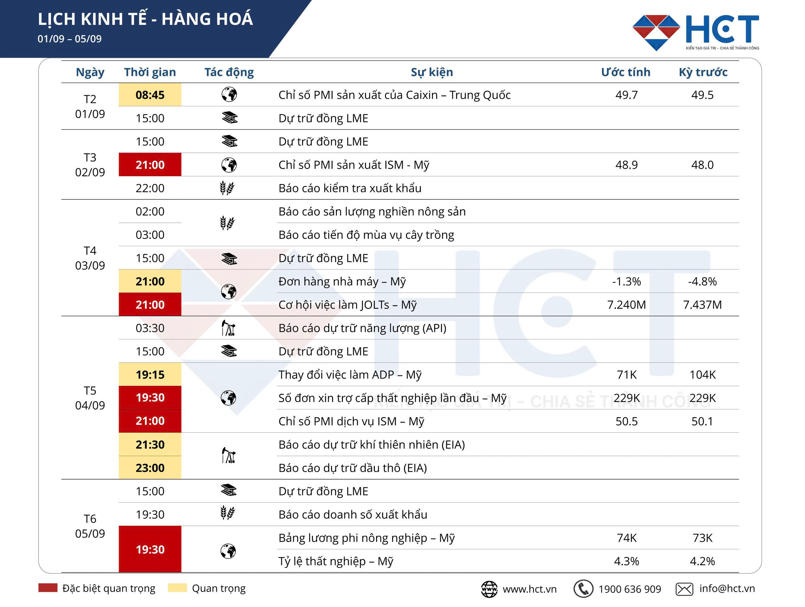 * Mỹ ** Báo cáo việc làm phi nông nghiệp (NFP) tháng 8 – tâm điểm lớn nhất. Nếu việc làm yếu, khả năng Fed cắt lãi suất tăng → tích cực cho vàng, bạc, dầu nhờ kỳ vọng lãi suất thấp hơn. PMI từ ISM & S...