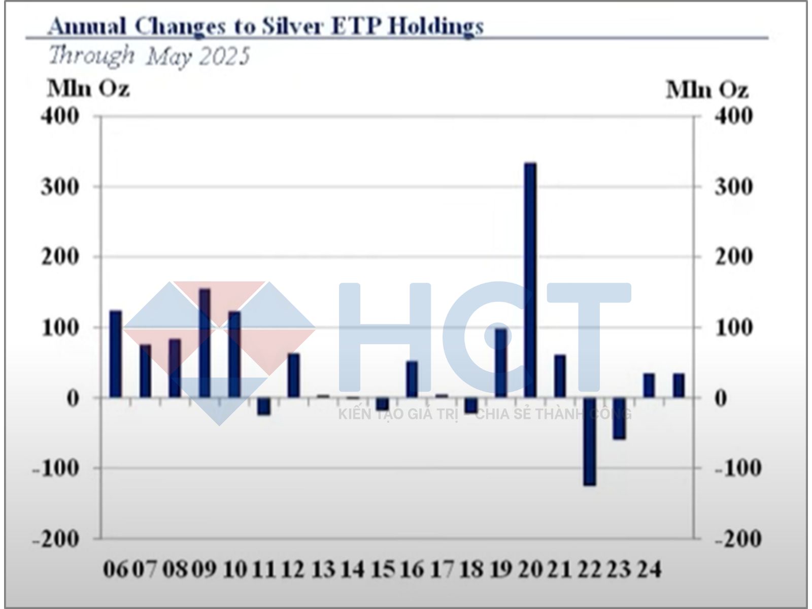 Một điểm đáng chú ý khác là dòng tiền đổ vào các quỹ ETF bạc tăng đột biến trong tháng 5. Chỉ riêng trong tháng này, nhà đầu tư đã mua ròng tới 24 triệu ounce bạc thông qua ETF – chiếm gần 70% tổng lượng mua ròng từ đầu năm. Đây là dấu hiệu cho thấy niềm tin dài hạn vào bạc đang dần quay lại, đặc biệt từ những nhà đầu tư tổ chức hoặc nhà đầu tư cá nhân muốn sở hữu bạc gián tiếp.