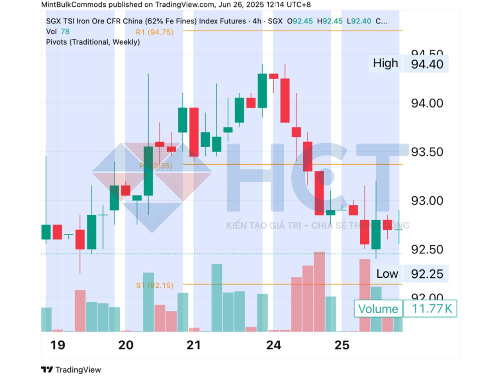 Từ mức mở cửa 92,60 USD/tấn vào ngày 19/6, giá đóng cửa ở 92,70 USD/tấn trong phiên ngày 25/6. Trong tuần, giá ghi nhận mức cao nhất tại 94,40 USD/tấn trong phiên ngày 24/6 và mức thấp nhất tại 92,25 USD/tấn vào ngày 19/6. Biên độ dao động trong tuần là 2,15 USD/tấn, thu hẹp so với tuần trước đó. Giá đã vượt lên trên ngưỡng kháng cự pivot tại 93,35 USD/tấn trong phiên giữa tuần nhưng đóng cửa dưới ngưỡng này vào ngày 25/6.