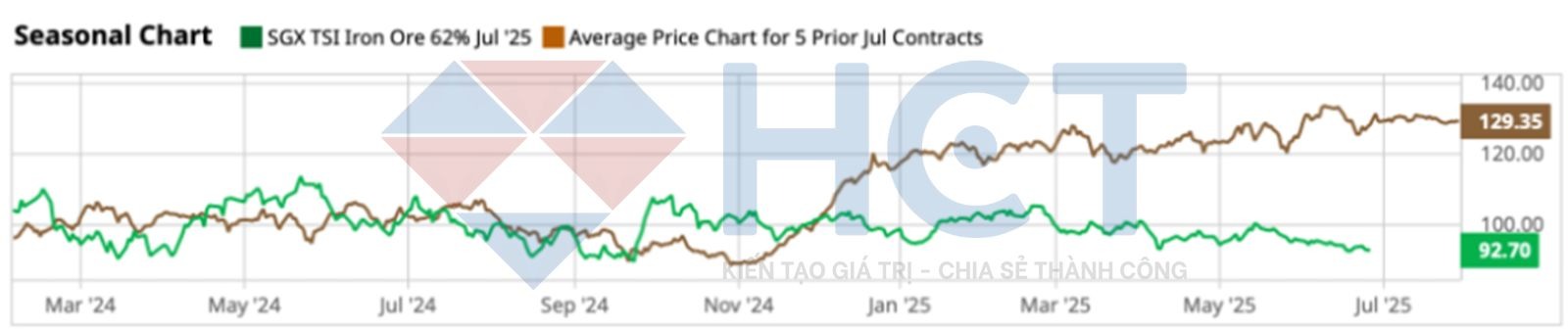 Dựa trên yếu tố mùa vụ, hợp đồng tương lai quặng sắt SGX kỳ hạn tháng 7 hiện đang giao dịch thấp hơn 27,48% so với mức trung bình 5 năm gần nhất (127,88 USD/tấn).