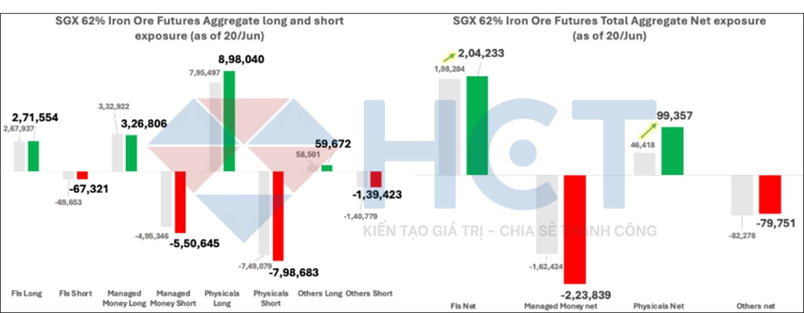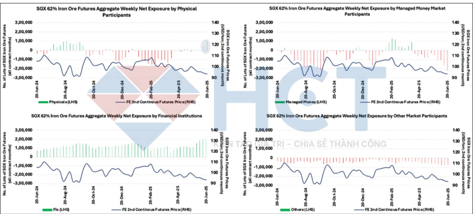 Lượng hàng xuất khẩu tăng từ Úc và Brazil đang khiến nguồn cung dồi dào hơn, trong khi sản lượng thép Trung Quốc giảm đã gây áp lực lên giá. Những chỉ số kinh tế vĩ mô của Trung Quốc có thể cải thiện trong đợt công bố tháng 7, nhưng điều này là không đủ để hỗ trợ giá trong dài hạn. Mức giá kỳ hạn hiện tại đang giao dịch thấp hơn 27,48% so với trung bình 5 năm gần nhất đã phản ánh rõ nét tâm lý bi quan trên thị trường.