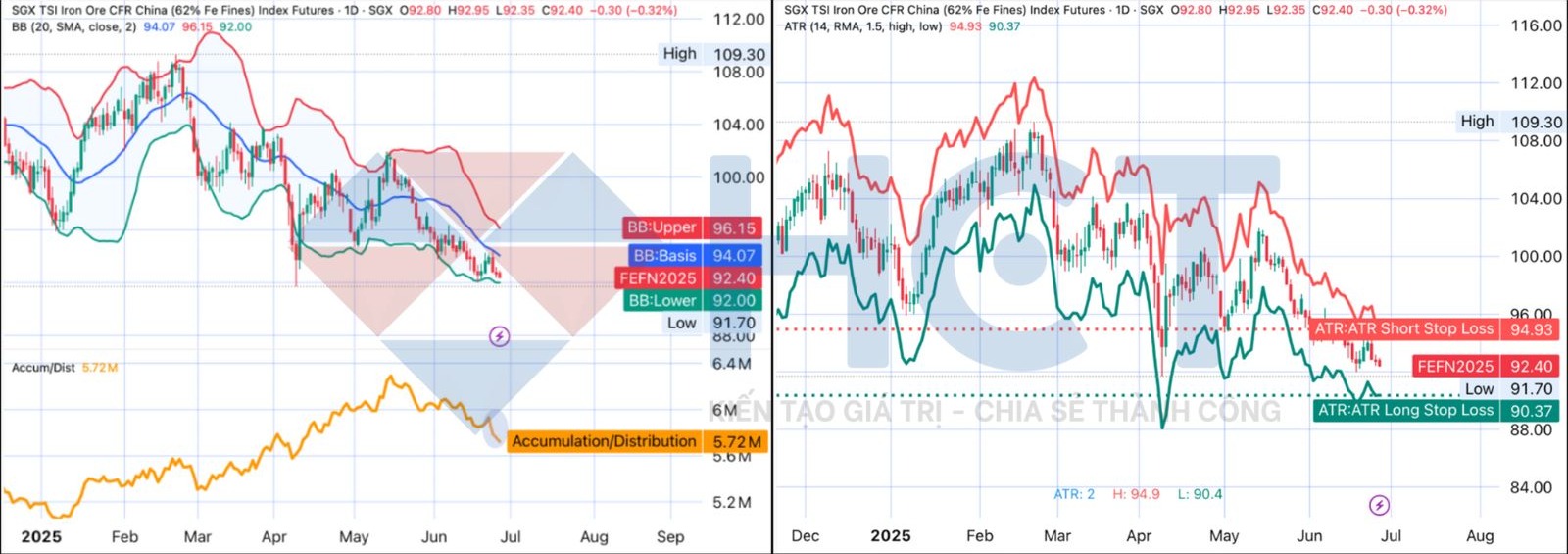 Ngưỡng dừng lỗ theo chỉ báo ATR: Dựa trên chỉ báo ATR, mức dừng lỗ cho vị thế mua được xác định tại 90,37 USD/tấn (thấp hơn 2,2% so với giá đóng cửa gần nhất), trong khi mức dừng lỗ cho vị thế bán là 94,93 USD/tấn (cao hơn 2,7%).