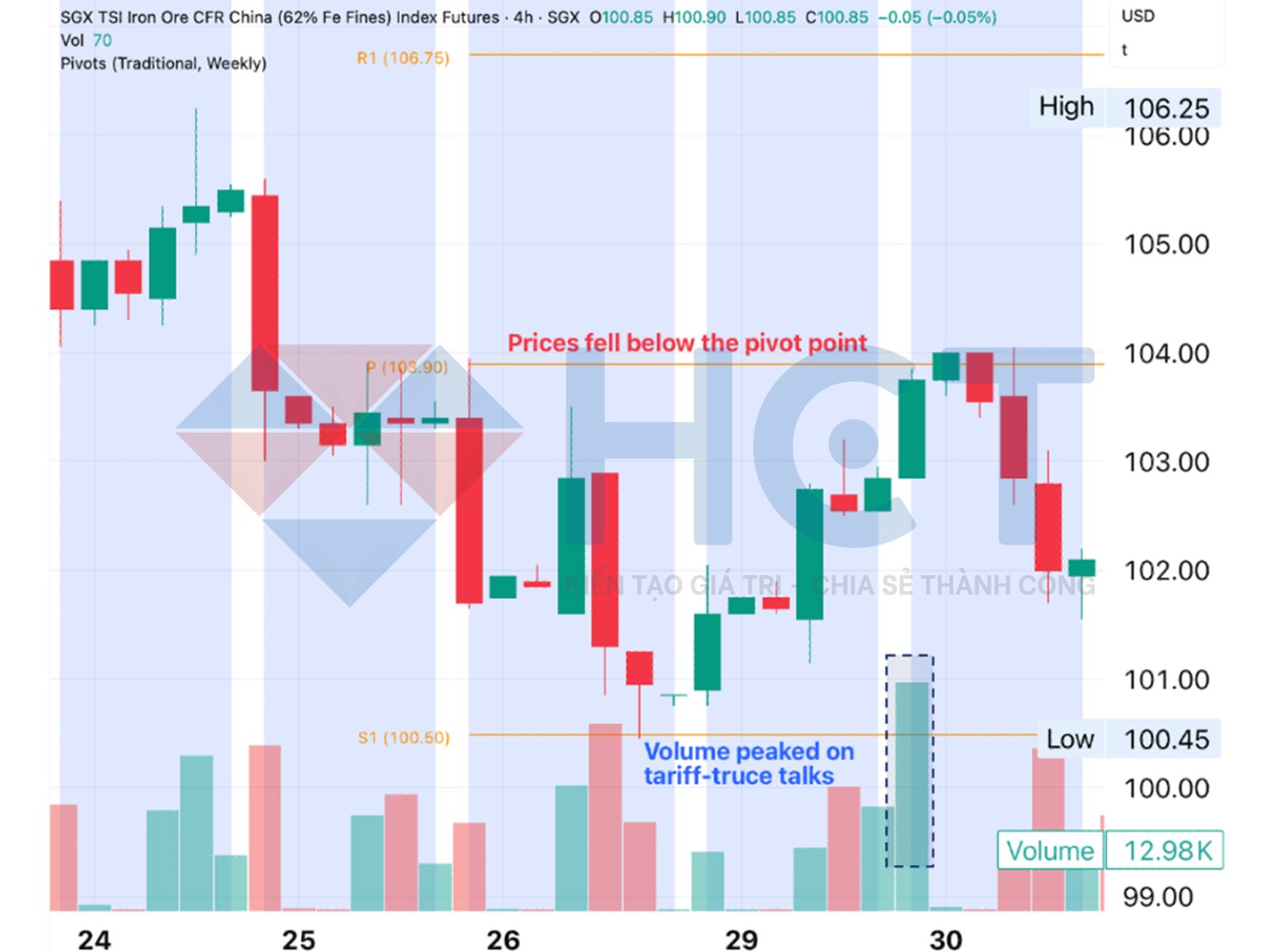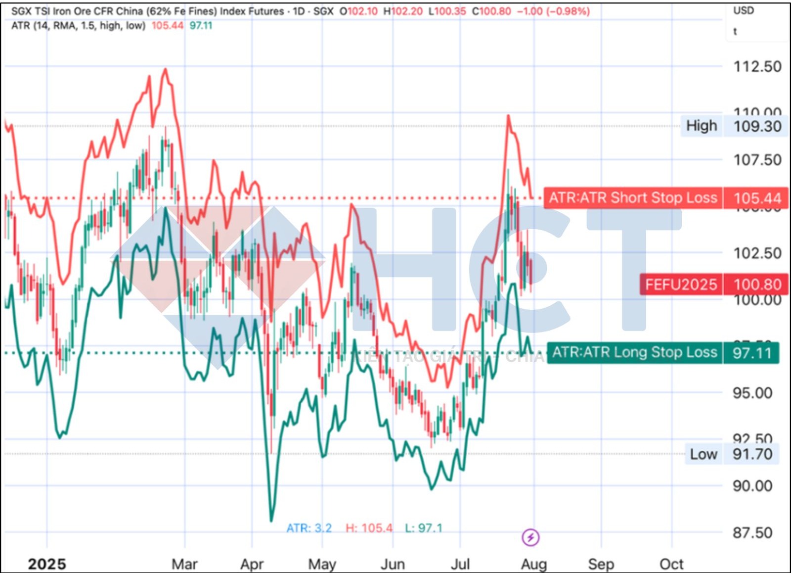 Phân tích ATR: Dựa trên chỉ báo ATR, điểm dừng lỗ cho các vị thế mua được xác định tại 97,11 USD/tấn (thấp hơn 3,7% so với giá đóng cửa gần nhất) và điểm dừng lỗ cho các vị thế bán tại 105,44 USD/tấn (cao hơn 4,6% so với giá đóng cửa gần nhất).