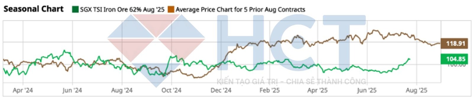 Xét theo yếu tố mùa vụ, hợp đồng tương lai quặng sắt SGX kỳ hạn tháng 8 hiện đang giao dịch thấp hơn 16,18% so với mức trung bình 5 năm gần nhất (124,60 USD/tấn).