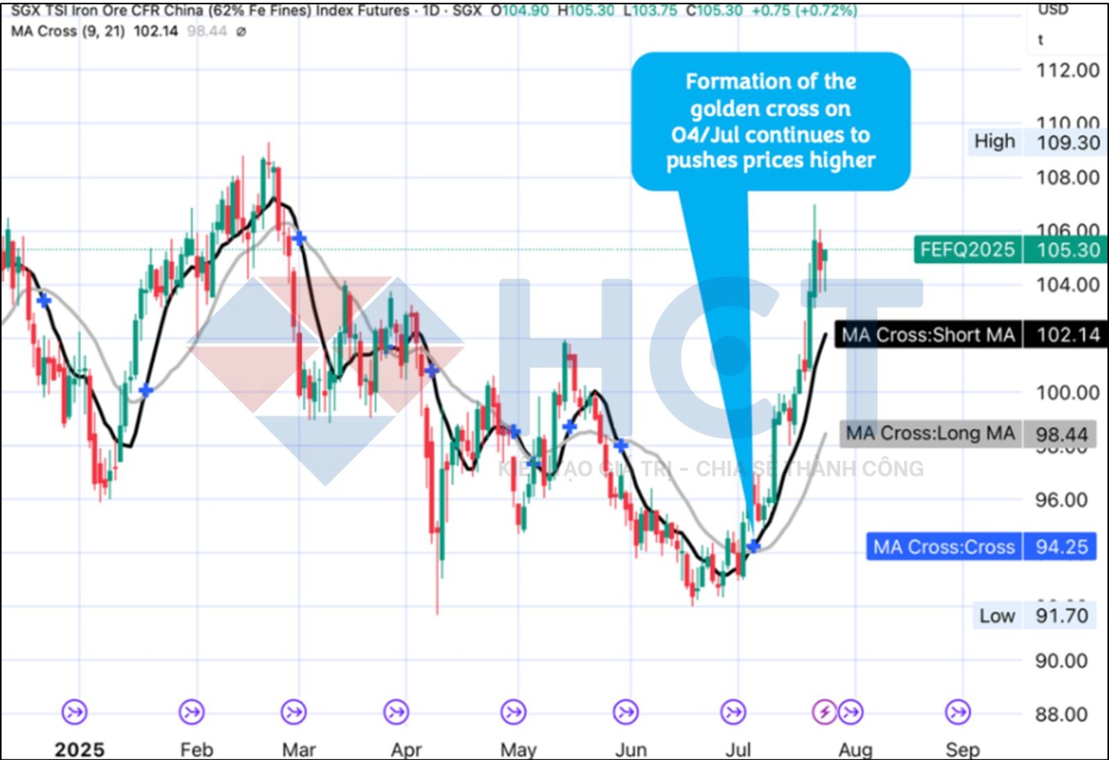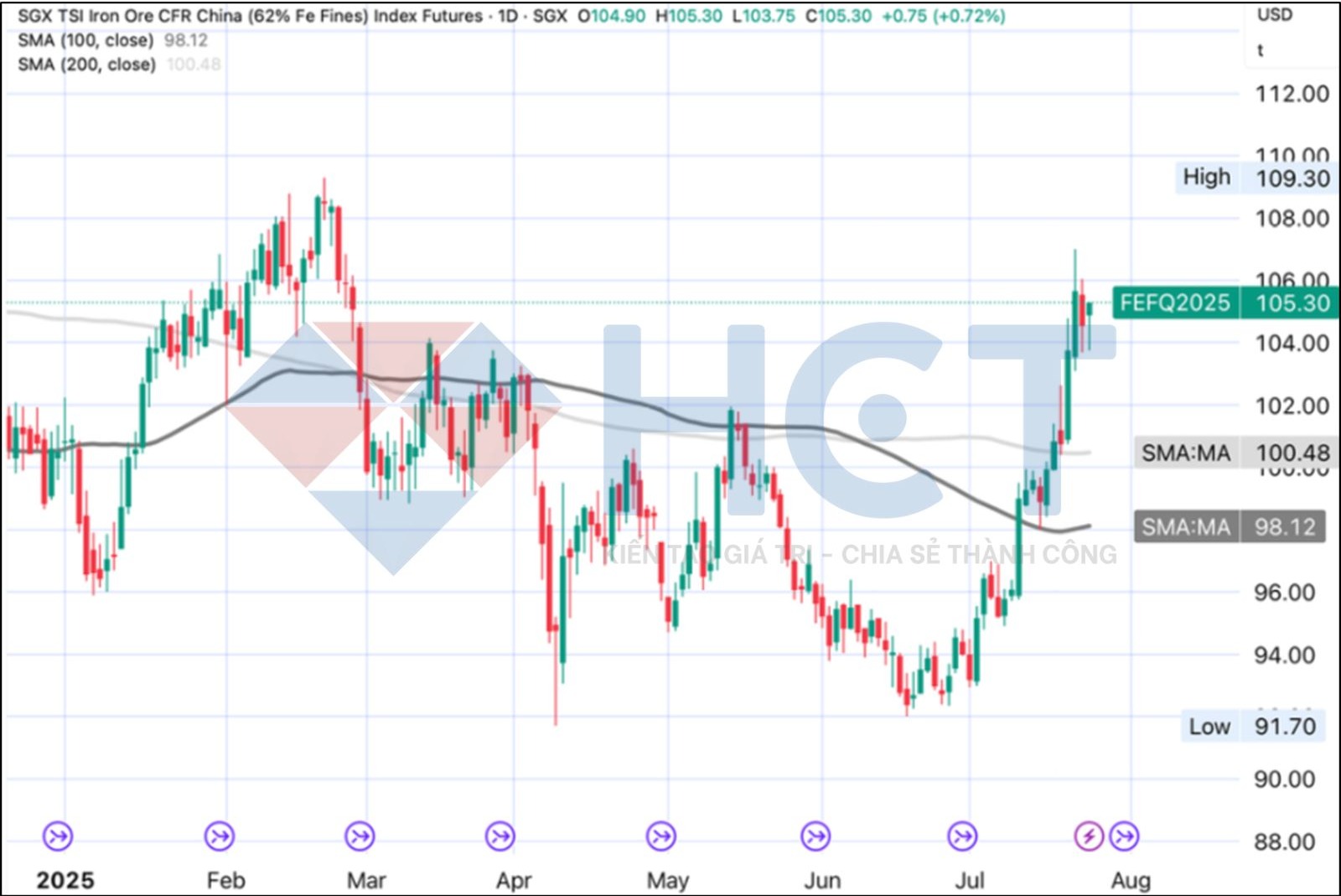 Giá quặng sắt đang duy trì trên các đường trung bình động quan trọng, phát tín hiệu lạc quan cho xu hướng ngắn, trung và dài hạn