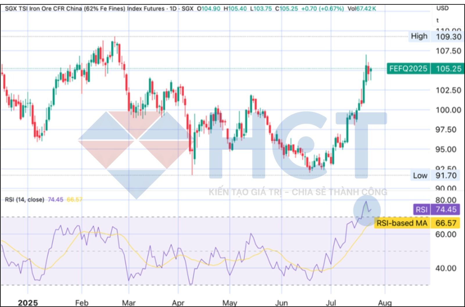 Phân tích RSI: Chỉ báo RSI hiện ở mức 74,45 cho thấy hợp đồng tương lai quặng sắt đang trong vùng quá mua, phản ánh đà tăng mạnh nhưng cũng làm gia tăng rủi ro điều chỉnh khi lực mua có thể suy yếu.