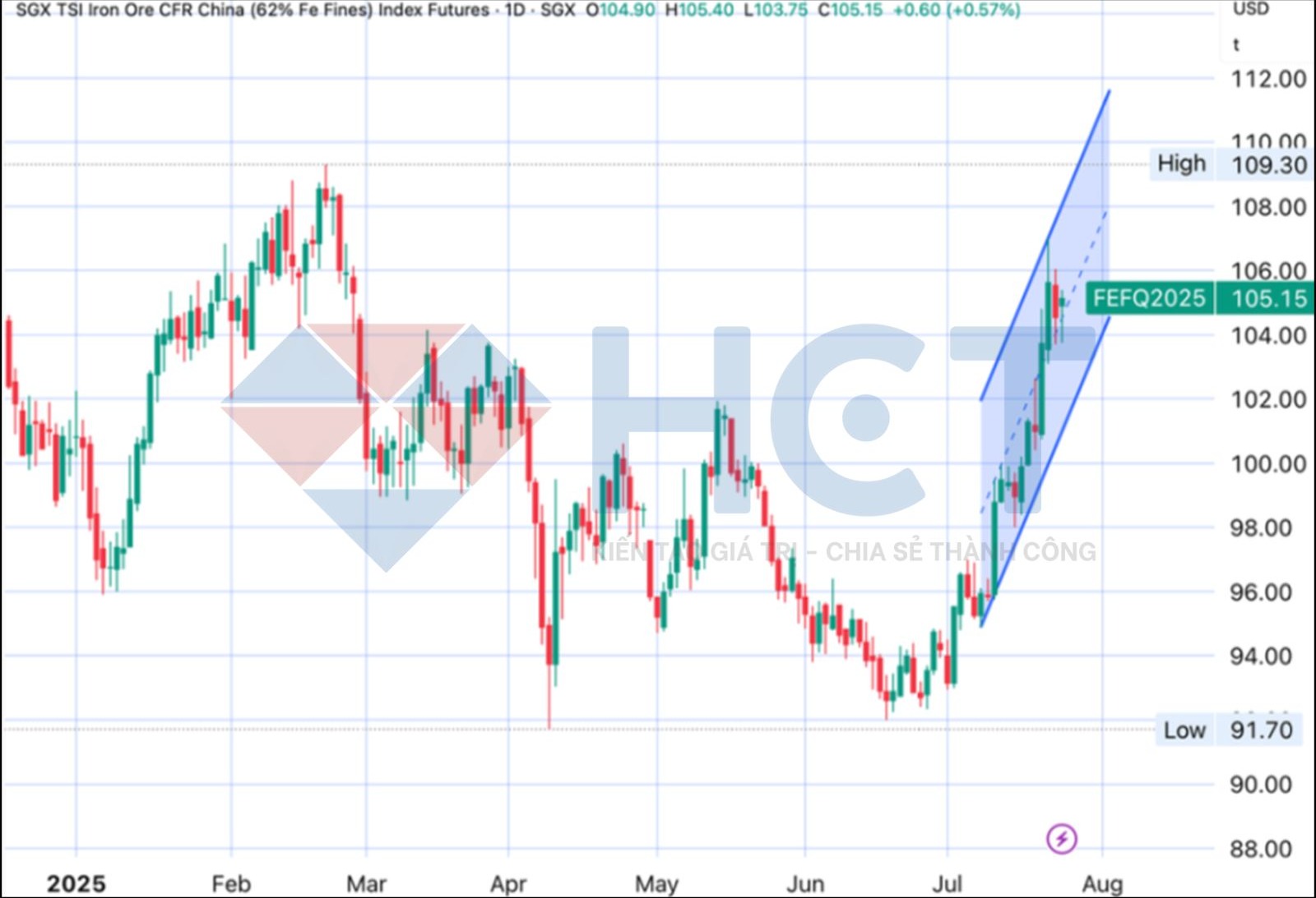 Giá hợp đồng tương lai quặng sắt SGX (62% Fe CFR Trung Quốc) kết thúc phiên ngày 23/7 tăng 3,35 USD/tấn so với đầu tuần.