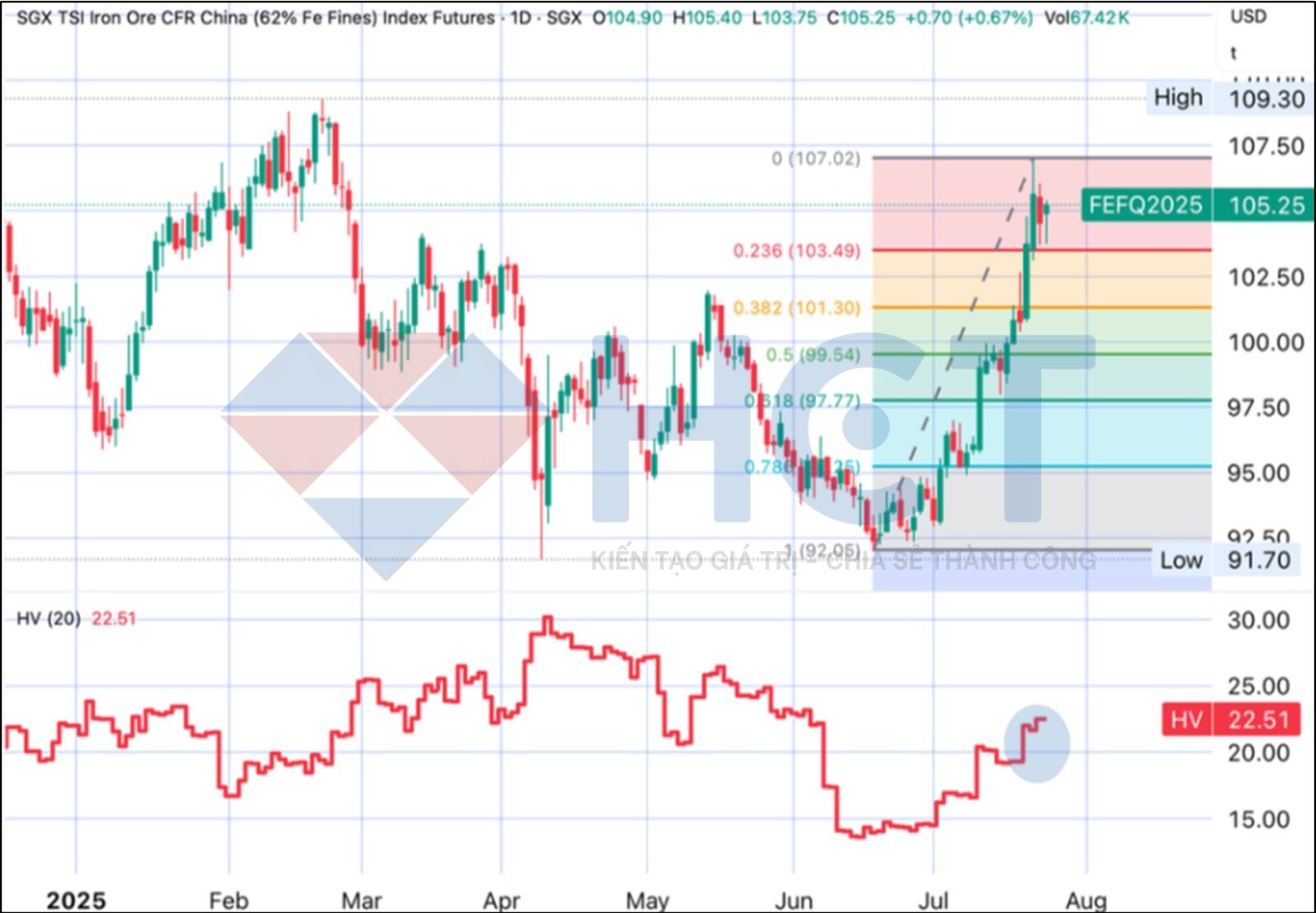 Phân tích Fibonacci và biến động lịch sử: Giá đang dao động trong vùng giữa các mốc hồi quy Fibonacci 50% – 0%. Trong ngắn hạn, nếu không có tin tức đột biến, giá quặng sắt dự kiến sẽ đi ngang trong vùng 103,49 – 107 USD/tấn, tương ứng các ngưỡng hỗ trợ và kháng cự gần nhất. Biến động lịch sử 20 ngày tăng 16,6%, từ 19,30% lên 22,51%, cho thấy mức độ biến động đang mở rộng trở lại.