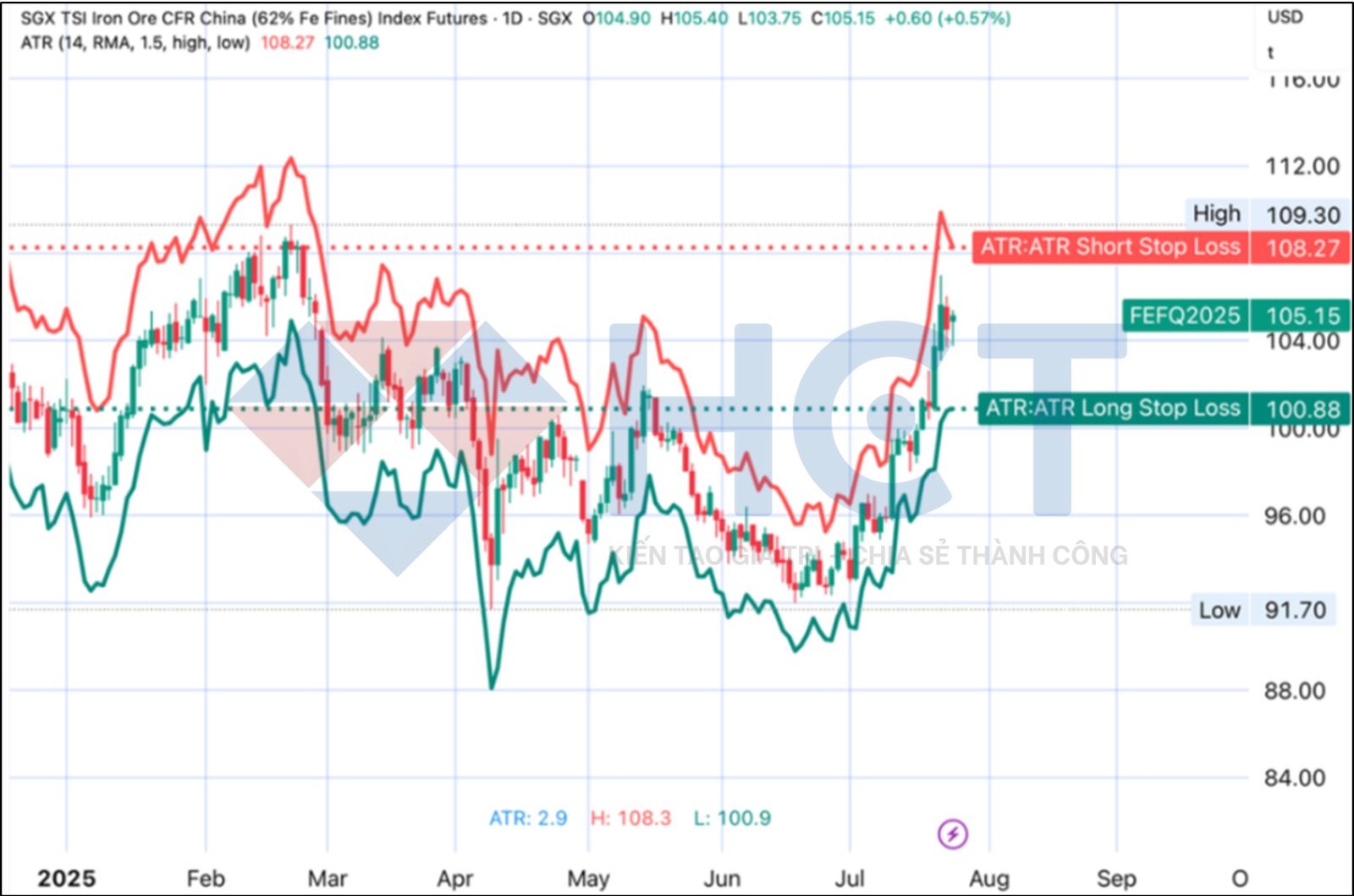 Ngưỡng dừng lỗ theo chỉ báo ATR: Theo ATR, điểm dừng lỗ cho vị thế mua được khuyến nghị tại 100,88 USD/tấn, thấp hơn 4,1% so với giá đóng cửa gần nhất. Ngược lại, vị thế bán có thể đặt dừng lỗ tại 108,27 USD/tấn, cao hơn 3% so với giá hiện tại.