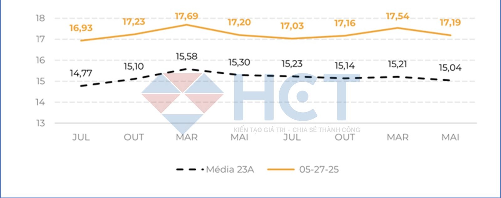 Bên cạnh đó, dữ liệu từ báo cáo gần nhất của UNICA cho thấy hoạt động ép mía tại Trung – Nam tuy đạt 42,3 triệu tấn trong nửa đầu tháng 5, cao hơn mức trung bình 5 năm ở mức 41,5 triệu tấn, nhưng vẫn thấp hơn đáng kể so với cùng kỳ niên vụ 2024/25. Tổng khối lượng mía đã ép lũy kế tính đến giữa tháng 5/2025 đạt 76,7 triệu tấn, thấp hơn gần 20 triệu tấn so với mức 96,2 triệu tấn trong cùng kỳ năm ngoái.