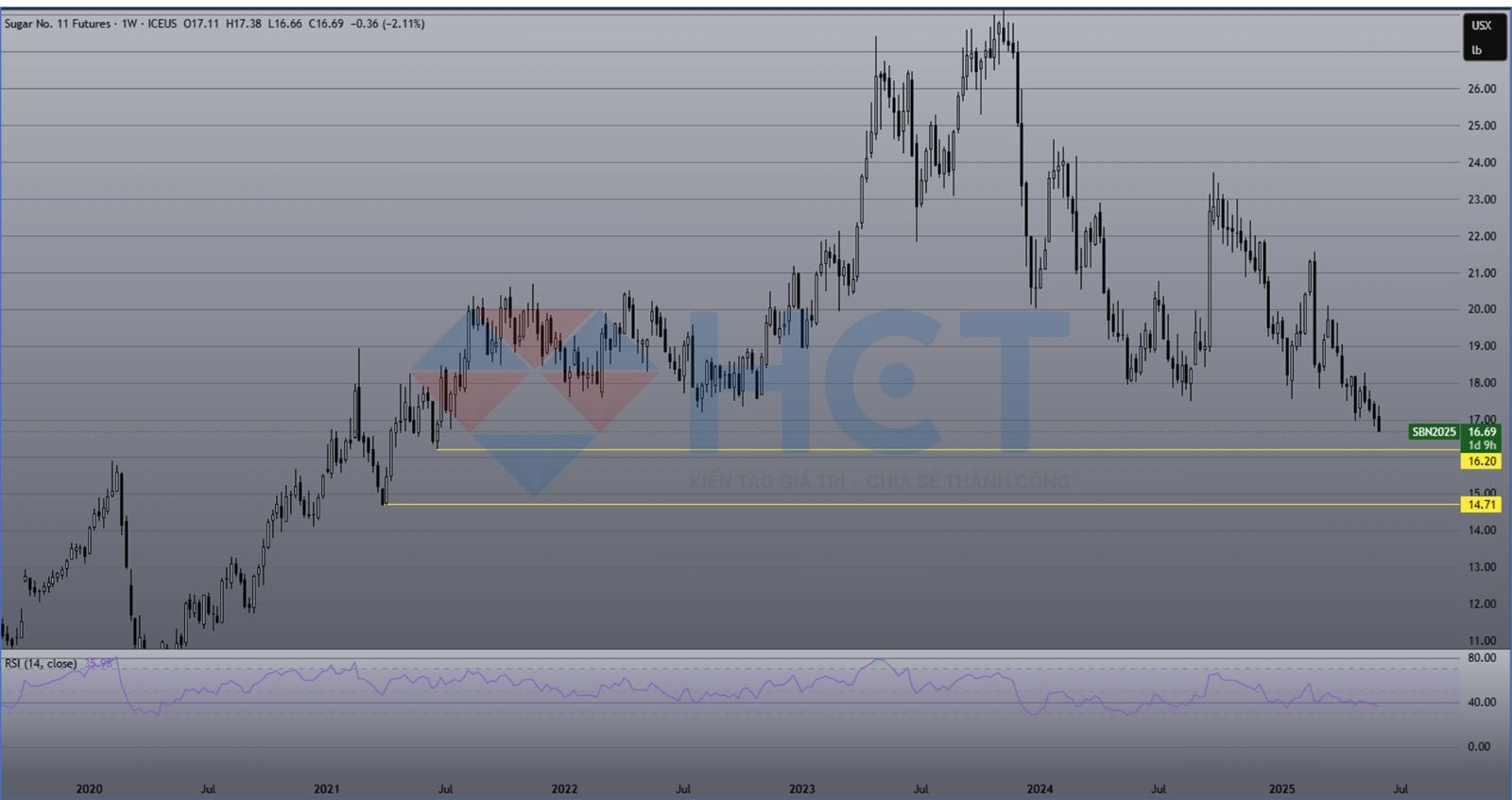 Trên biểu đồ liên tục giá đường đang tiếp tục xu hướng giảm kéo dài từ đỉnh năm 2023, hiện tiệm cận vùng hỗ trợ kỹ thuật quan trọng quanh 16.20–16.00 cent/pound và có khả năng tạo phản ứng giá trong ngắn hạn. Nếu vùng hỗ trợ này không giữ được, áp lực bán có thể đẩy giá lùi về vùng hỗ trợ sâu hơn tại 14.70, vùng đáy trung hạn được xác lập trong năm 2022.