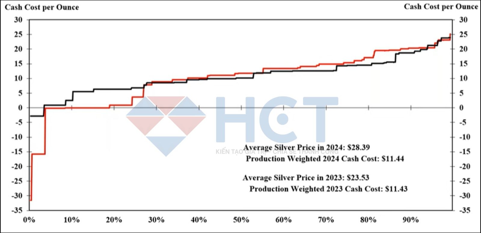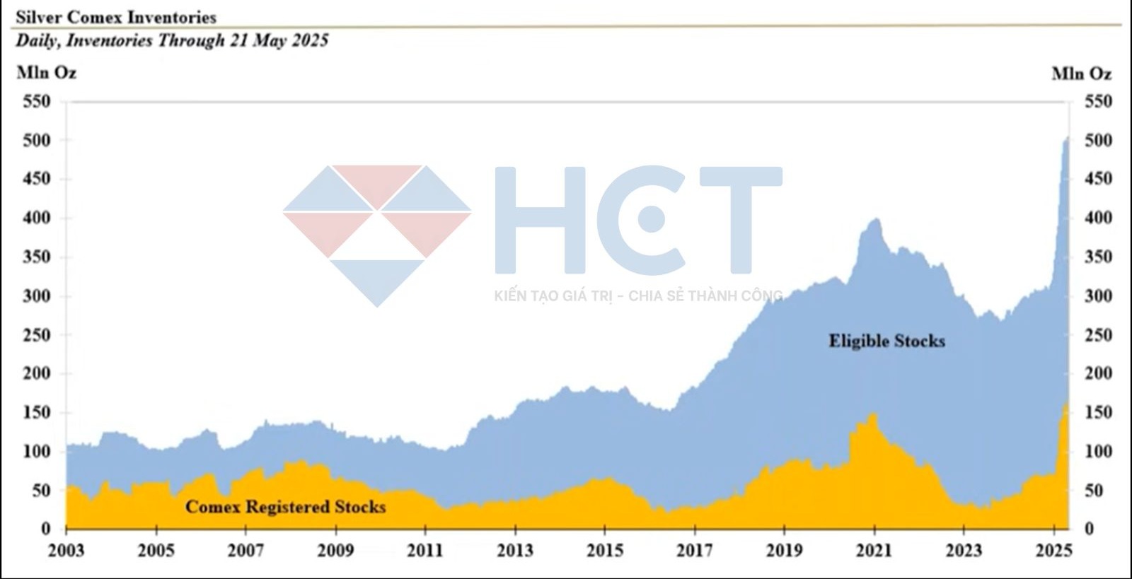 Chi phí khai thác năm 2024 gần như đi ngang ở mức 11,44 USD/oz, dự báo sẽ tăng nhẹ trong 2025 do giá bạc cao hơn và lạm phát quay trở lại. Tồn kho vật chất tại các trung tâm giao dịch như COMEX (hơn 500 triệu oz) và London (700 triệu oz) tiếp tục ở mức cao, cho thấy lượng bạc phân bổ vẫn đủ đáp ứng nhu cầu ngắn hạn.