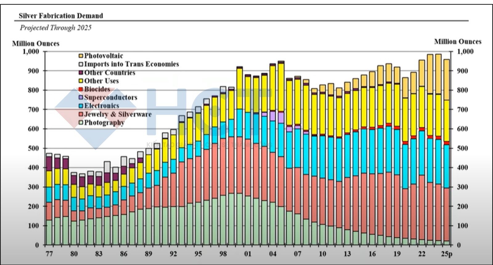 Trong công nghiệp, bạc tiếp tục giữ vai trò không thể thiếu trong lĩnh vực năng lượng tái tạo. Năm 2024, nhu cầu bạc đạt đỉnh 986 triệu oz – cao nhất lịch sử – với gần 21% dành cho ngành năng lượng mặt trời. Tuy nhiên, nhu cầu trong lĩnh vực này dự báo sẽ giảm nhẹ xuống 959,4 triệu oz trong năm 2025, do giá bạc cao và kinh tế suy yếu. Mặt khác, các lĩnh vực khác như điện tử và xe điện vẫn sẽ tiếp tục hỗ trợ cầu.