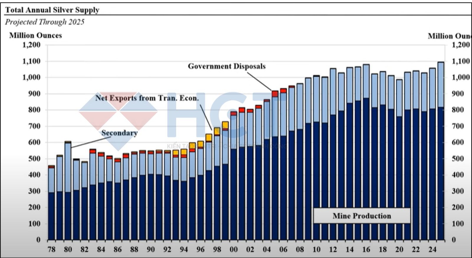 Về nguồn cung, tổng cung bạc dự kiến sẽ đạt kỷ lục mới 1,09 tỷ oz vào năm 2025 nhờ cả khai thác lẫn tái chế. Tuy nhiên, công suất khai thác mới vẫn hạn chế. Mặc dù có 3 mỏ mới đi vào hoạt động, sản lượng bổ sung chỉ khoảng 7 triệu oz, trong khi trung bình các năm trước từng đạt hơn 35 triệu oz/năm. Thời gian đưa mỏ vào vận hành hiện kéo dài tới 18 – 20 năm – một trở ngại lớn trong việc mở rộng nguồn cung.