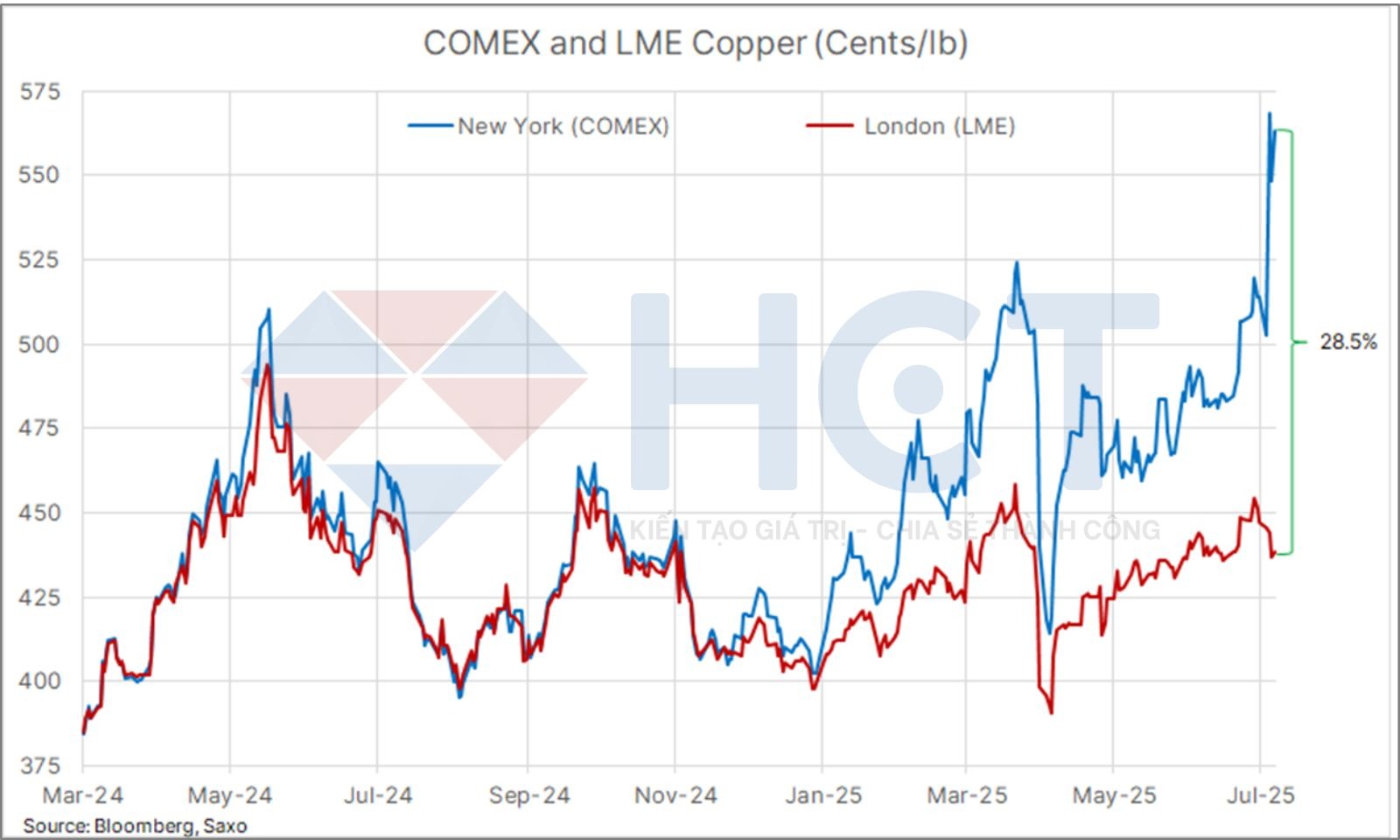 Trong số các kim loại công nghiệp, đồng là mặt hàng đang hứng chịu sự giằng kéo rõ rệt giữa lực đẩy chính trị và thực tế cung – cầu toàn cầu. Việc Mỹ chính thức áp dụng thuế nhập khẩu 50% đối với đồng từ ngày 1/8 đã làm giá đồng trên sàn COMEX vọt lên mức cao kỷ lục, tạo ra khoảng chênh lệch lên tới 1.000–3.000 USD mỗi tấn giữa giá nội địa Mỹ và giá tại London.