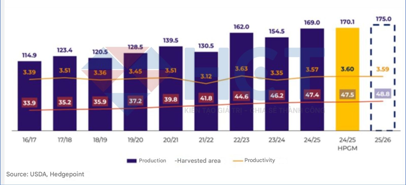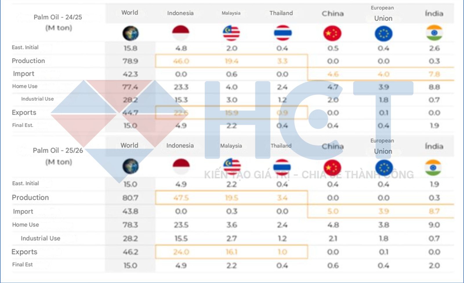 Niên vụ 2025/26 được dự báo ghi nhận sự gia tăng sản lượng và xuất khẩu dầu cọ tại hai quốc gia sản xuất lớn nhất thế giới là Indonesia và Malaysia. Đáng chú ý, Ấn Độ thị trường nhập khẩu dầu cọ lớn nhất toàn cầu đã giảm thuế nhập khẩu và dự kiến nâng khối lượng mua lên 8,7 triệu tấn, so với mức 7,8 triệu tấn trước đó.