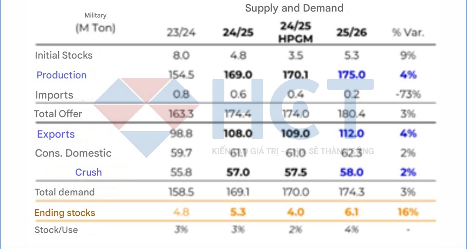Niên vụ 2024/25 của Brazil được dự báo đạt sản lượng khoảng 170 triệu tấn, với xuất khẩu có thể lập kỷ lục 109 triệu tấn nhờ nhu cầu nhập khẩu mạnh mẽ từ Trung Quốc. Hoạt động nghiền ép duy trì ở mức cao và được hỗ trợ thêm bởi chính sách áp dụng tỷ lệ pha trộn nhiên liệu sinh học B15 từ tháng 8 tới.