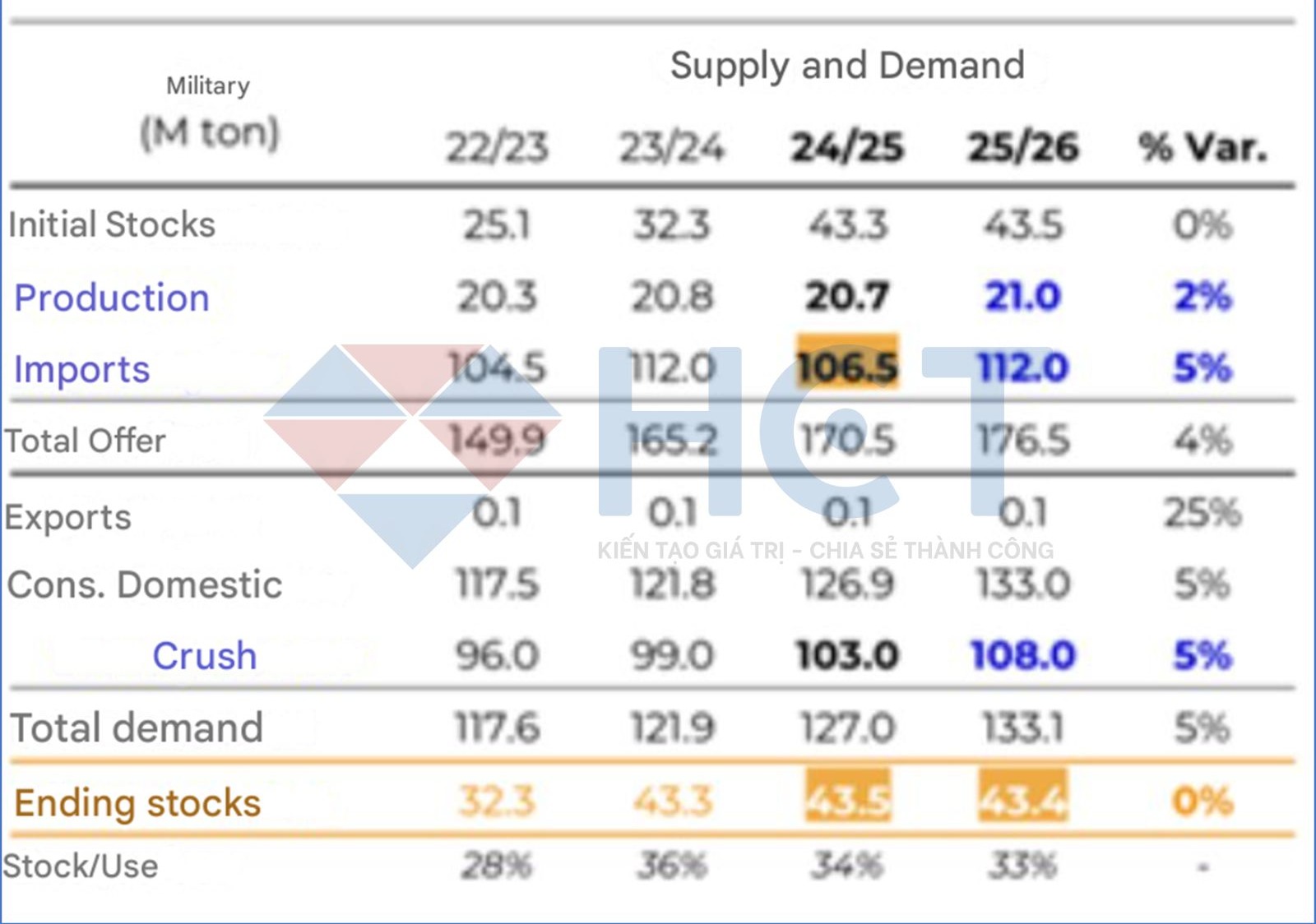 Nhập khẩu niên vụ 2024/25 được điều chỉnh giảm từ 108 triệu xuống 106,5 triệu tấn, phản ánh nhu cầu yếu do quá trình tái xây dựng tồn kho và lợi nhuận nghiền thấp. Dù vậy, Bộ Nông nghiệp Mỹ (USDA) dự báo nhập khẩu có thể tăng lên 112 triệu tấn trong năm 2025/26, nếu biên lợi nhuận nghiền và tiêu thụ nội địa được cải thiện.
