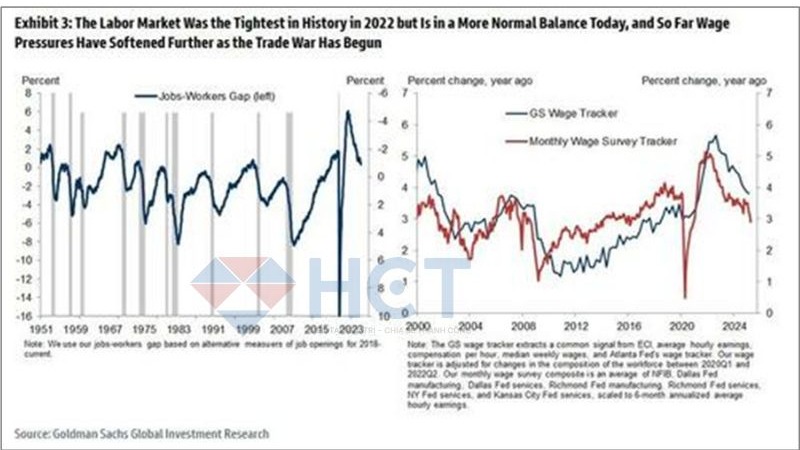 Thứ hai, thị trường lao động hiện nay đã cân bằng hơn so với giai đoạn trước. Chỉ số dự báo tăng trưởng tiền lương của Goldman đã giảm xuống 2.9%, phù hợp với mức lạm phát dưới mục tiêu 2%.