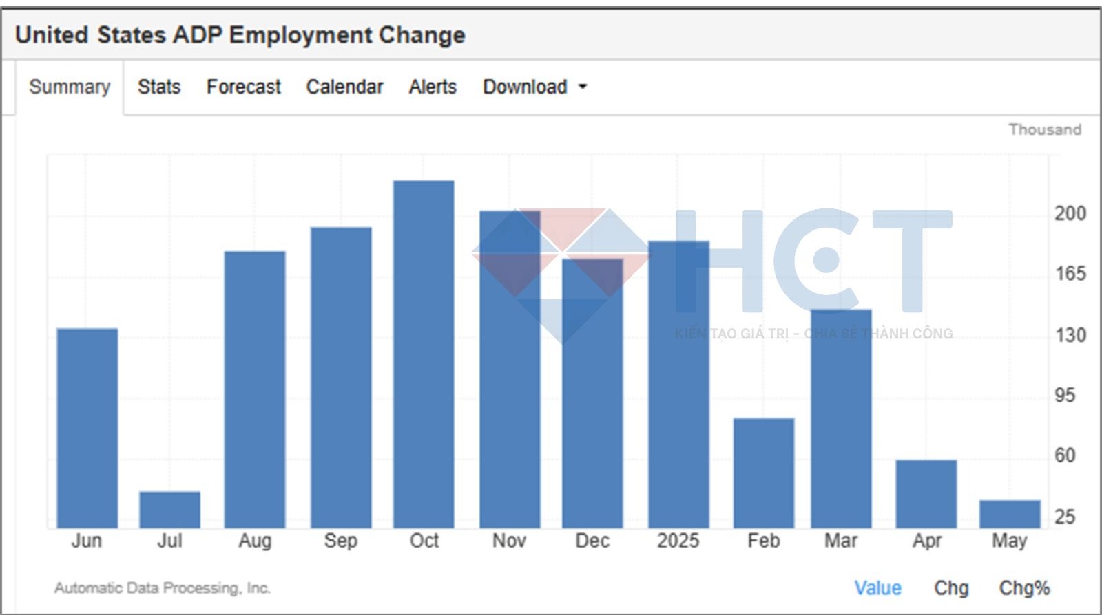 Theo báo cáo ADP công bố hôm thứ Tư, khu vực tư nhân Mỹ chỉ tạo ra 37.000 việc làm trong tháng 5 – thấp hơn rất nhiều so với kỳ vọng 110.000, và giảm mạnh so với mức đã điều chỉnh 60.000 trong tháng 4. Đây là mức tăng thấp nhất trong vòng 2 năm, và đánh dấu tháng thứ hai liên tiếp dữ liệu ADP trượt kỳ vọng.