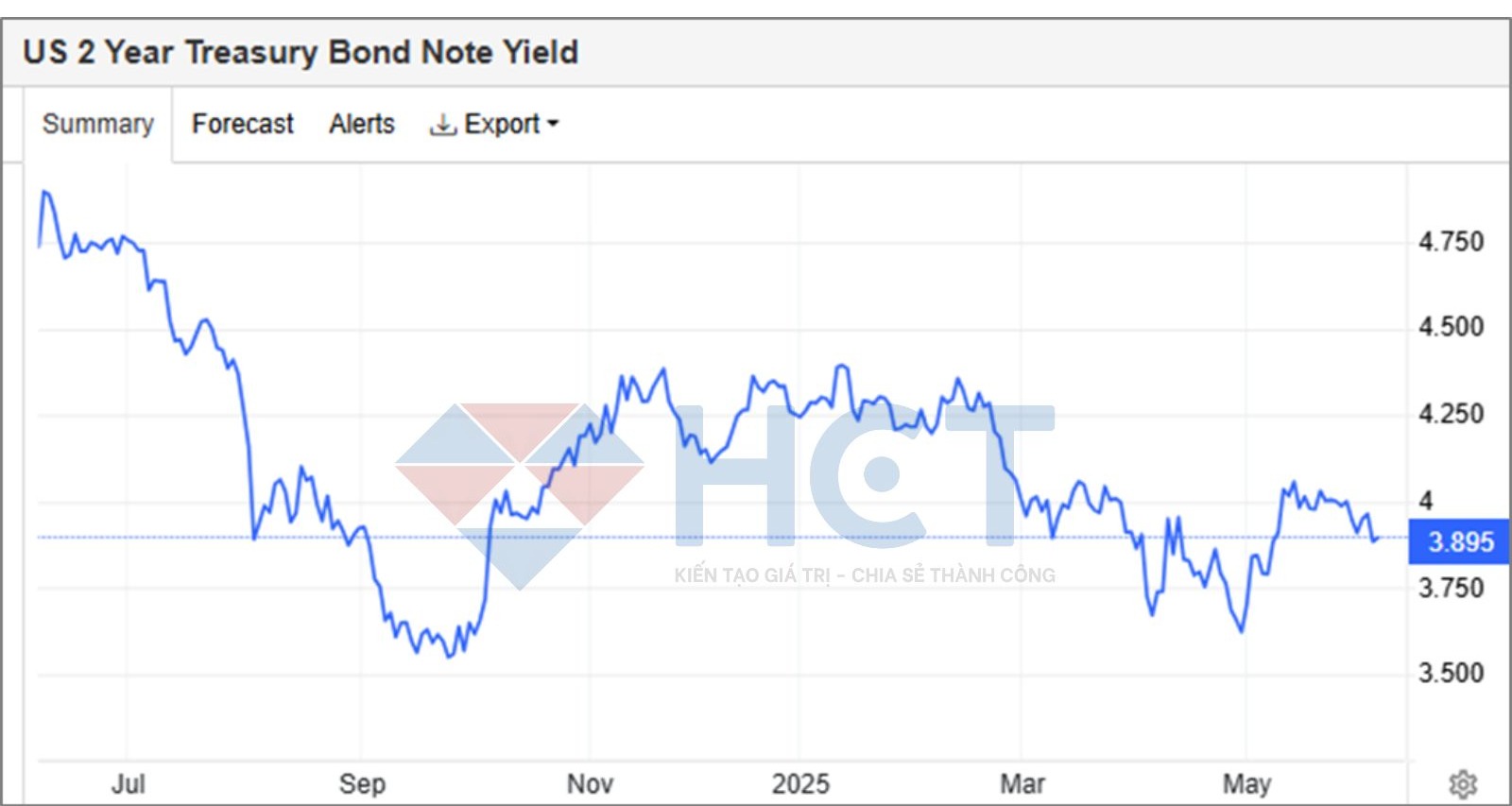 Lợi suất trái phiếu Mỹ kỳ hạn 2 năm giảm xuống 3.86%, mức thấp nhất kể từ 7/5, trong khi lợi suất 10 năm cũng rơi về 4.36%. Đường cong lợi suất đang bắt đầu “phẳng lại”, phản ánh lo ngại nền tảng vĩ mô suy yếu chứ không còn là câu chuyện cung – cầu trái phiếu ngắn hạn.