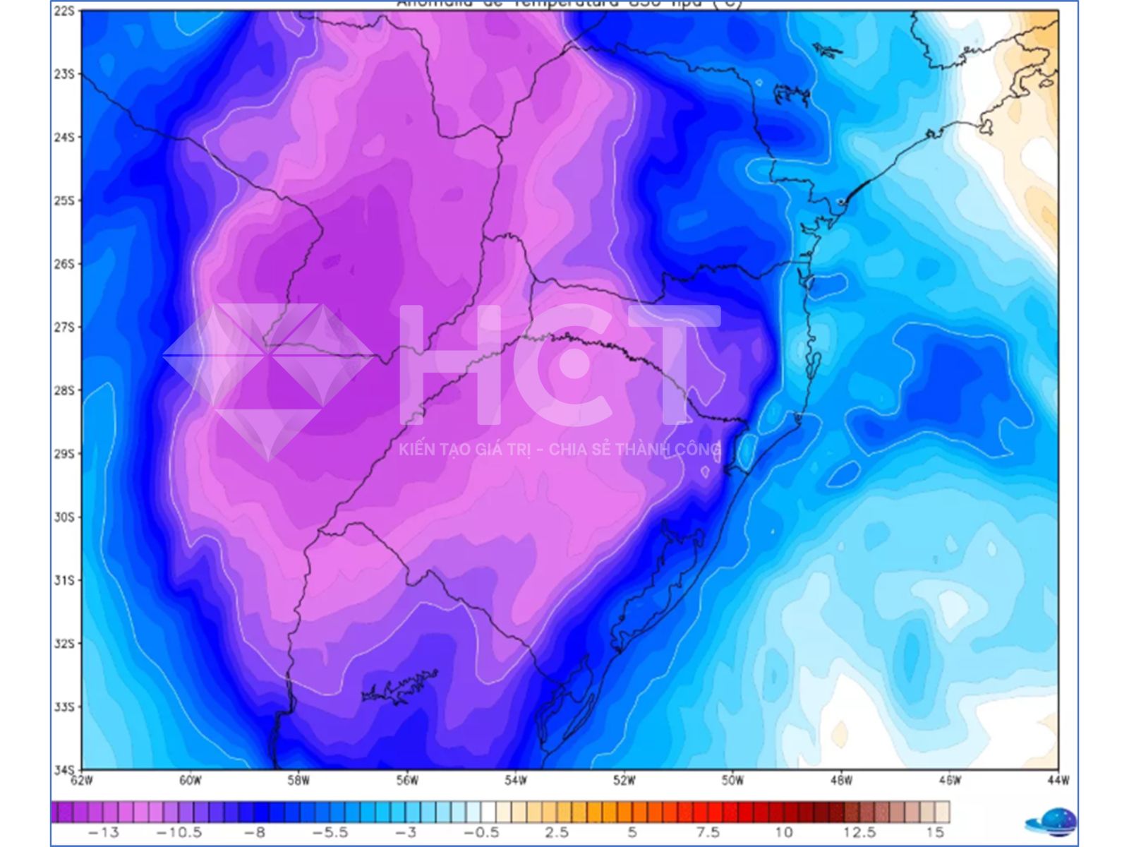 Bản đồ dị thường nhiệt độ ở độ cao 850 hPa (1500 mét) từ mô hình châu Âu cho thấy không khí lạnh đang tràn vào miền nam Brazil vào cuối thứ Tư