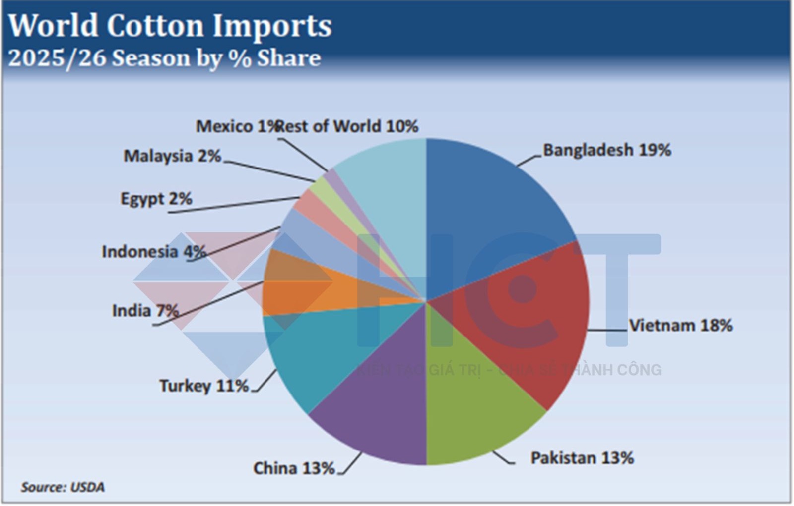 Nhập khẩu bông của Trung Quốc (5,8 triệu kiện) có khả năng sẽ giảm nhập từ Mỹ trong bối cảnh căng thẳng thương mại giữa hai nước vẫn cao. Tuy nhiên, có nhiều hy vọng Mỹ sẽ gia tăng thị phần xuất khẩu bông sang Ấn Độ (3,0 triệu kiện) và Pakistan (5,0 triệu kiện) nếu nhiều thỏa thuận thương mại được hoàn tất. Kết quả là, dự báo xuất khẩu bông Mỹ niên vụ 2025/26 có thể được điều chỉnh tăng, điều này có thể trở thành yếu tố thúc đẩy một đợt tăng giá bông, có khả năng kiểm định lại các mức đỉnh của năm 2025.