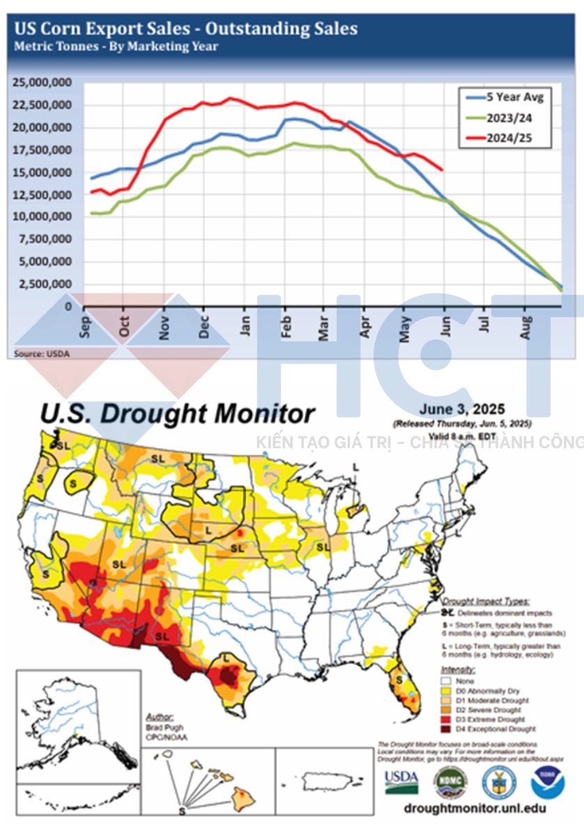 Về phía nhu cầu, hoạt động xuất khẩu ngô vụ cũ của Mỹ tiếp tục là điểm sáng trong năm nay, bất chấp những bất ổn liên quan đến chính sách thuế. Theo ước tính của USDA, mục tiêu xuất khẩu ngô vụ cũ trong niên vụ hiện tại gần như đã hoàn thành, với khoảng 97% đến 100% đã được giao hàng hoặc chốt hợp đồng , dù thị trường vẫn còn ba tháng nữa mới kết thúc niên vụ. Điều này cho thấy nhiều khả năng USDA sẽ phải điều chỉnh tăng dự báo xuất khẩu trong báo cáo Cung – Cầu nông sản (WASDE) công bố ngày 12/6 tới.