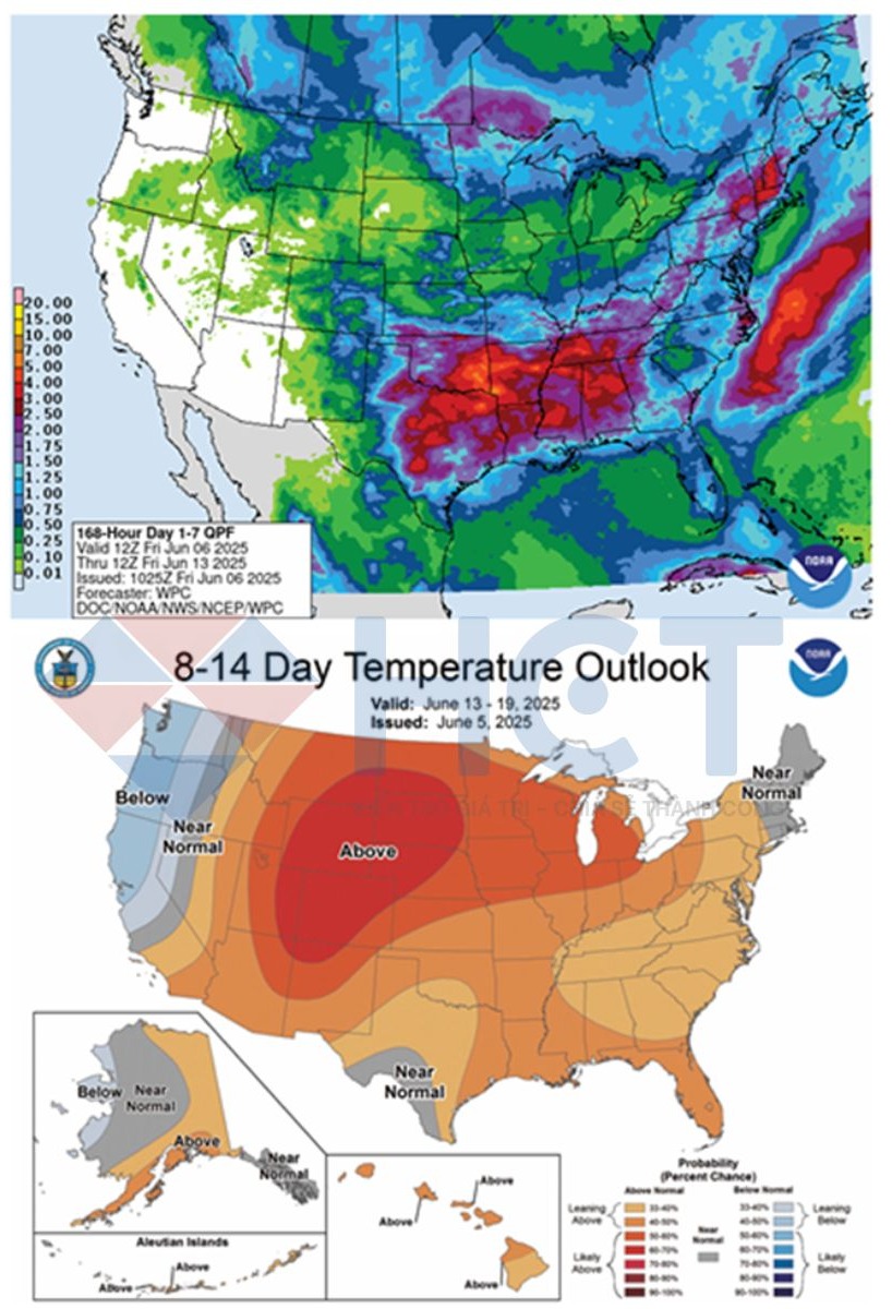 Hiện tại, điều kiện thời tiết tại Mỹ nhìn chung vẫn tích cực, với độ ẩm đất ổn định trên phần lớn khu vực vành đai ngô, tạo nền tảng thuận lợi cho giai đoạn sinh trưởng đầu mùa. Dự báo cho thấy lượng mưa đáng kể sẽ xuất hiện tại miền nam Trung Tây trong tuần tới, trước khi thời tiết chuyển sang khô hơn từ giữa tháng. Tuy nhiên, sự chuyển dịch này cũng tiềm ẩn rủi ro thời tiết vào tháng 7, đặc biệt trong giai đoạn thụ phấn, giai đoạn then chốt đối với năng suất.