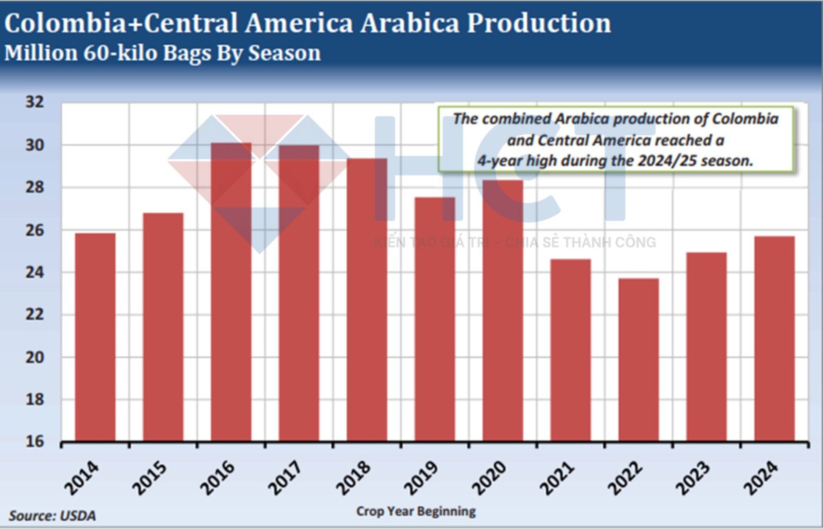 Giá cà phê nhận được lực hỗ trợ từ tình trạng khô hạn tại Brazil, khiến nhiều nhà phân tích dự báo sản lượng Arabica vụ 2025/26 sẽ sụt giảm đáng kể so với niên vụ 2024/25. Tuy nhiên, cần lưu ý rằng sản lượng Arabica toàn cầu niên vụ 2024/25 đã đạt mức cao nhất trong 4 năm, ở mức 97,845 triệu bao, với mức tăng sản lượng đáng kể từ Colombia, Honduras, Peru và Nicaragua. Nếu xu hướng gia tăng sản lượng này tiếp diễn trong khi nhu cầu toàn cầu suy yếu, giá cà phê có thể sẽ tiếp tục giảm trong thời gian tới.