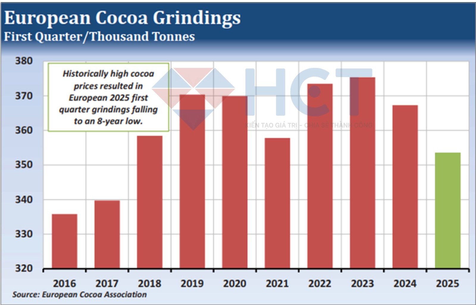 Giá ca cao đã hai lần kiểm định lại mức đỉnh lịch sử được thiết lập vào tháng 12, và mỗi lần đều dẫn đến nhịp điều chỉnh sau đó. Mức giá cao kỷ lục đã khiến các nhà sản xuất sô-cô-la ưu tiên sử dụng hàng tồn kho thay vì mua hạt mới, từ đó làm giảm nhu cầu đối với cacao vụ mới. Dù thị trường ca cao đã cho thấy sự vững vàng trước sự sụt giảm nhu cầu tiêu dùng, nhưng hiện đang xuất hiện những dấu hiệu rõ ràng rằng mức giá trên 10.000 USD/tấn là quá cao, qua đó làm gia tăng rủi ro điều chỉnh giảm trong dài hạn.