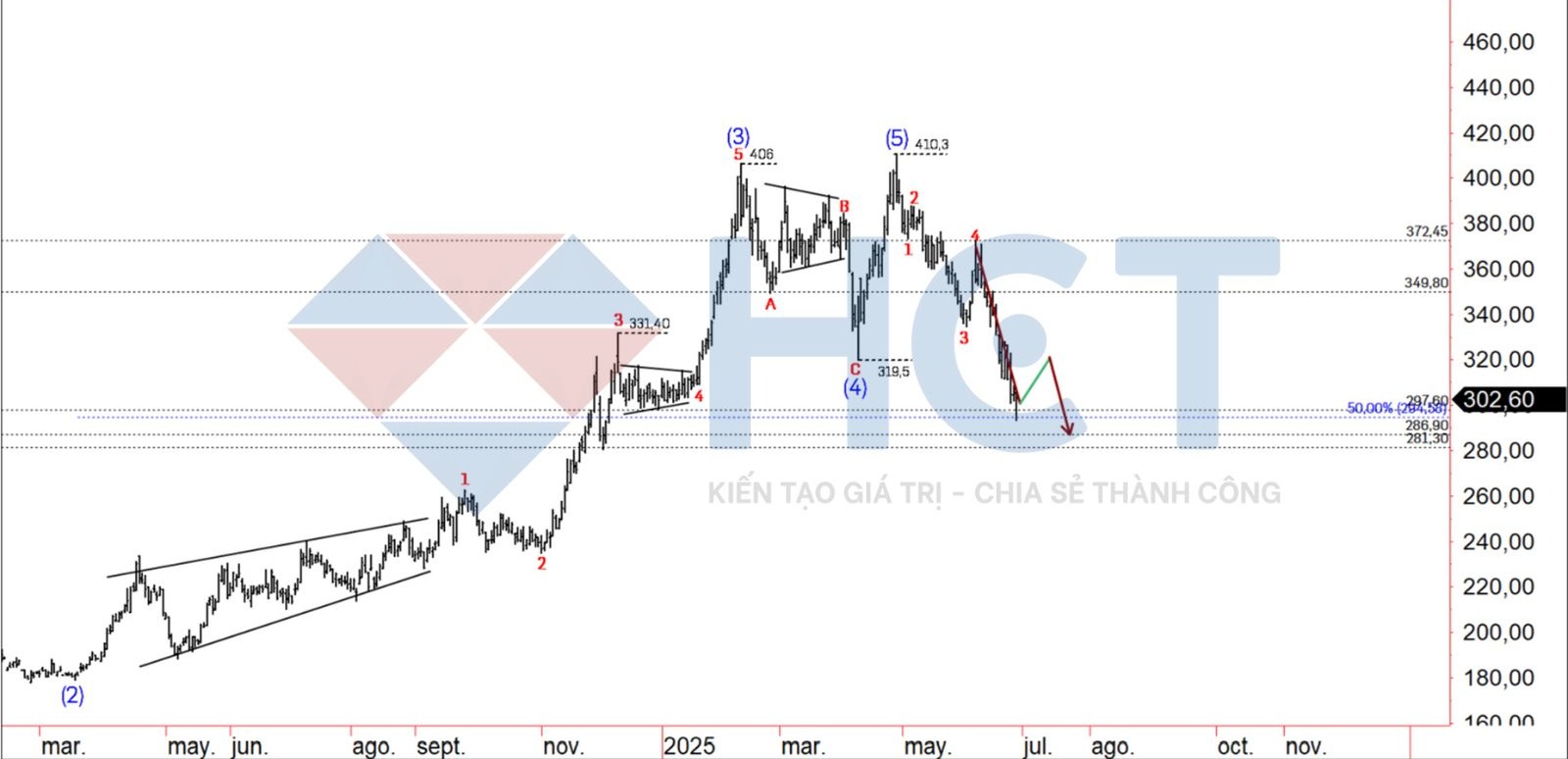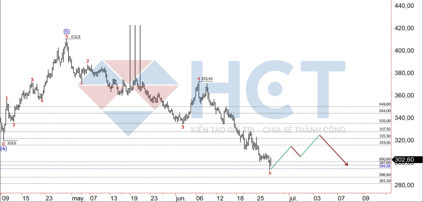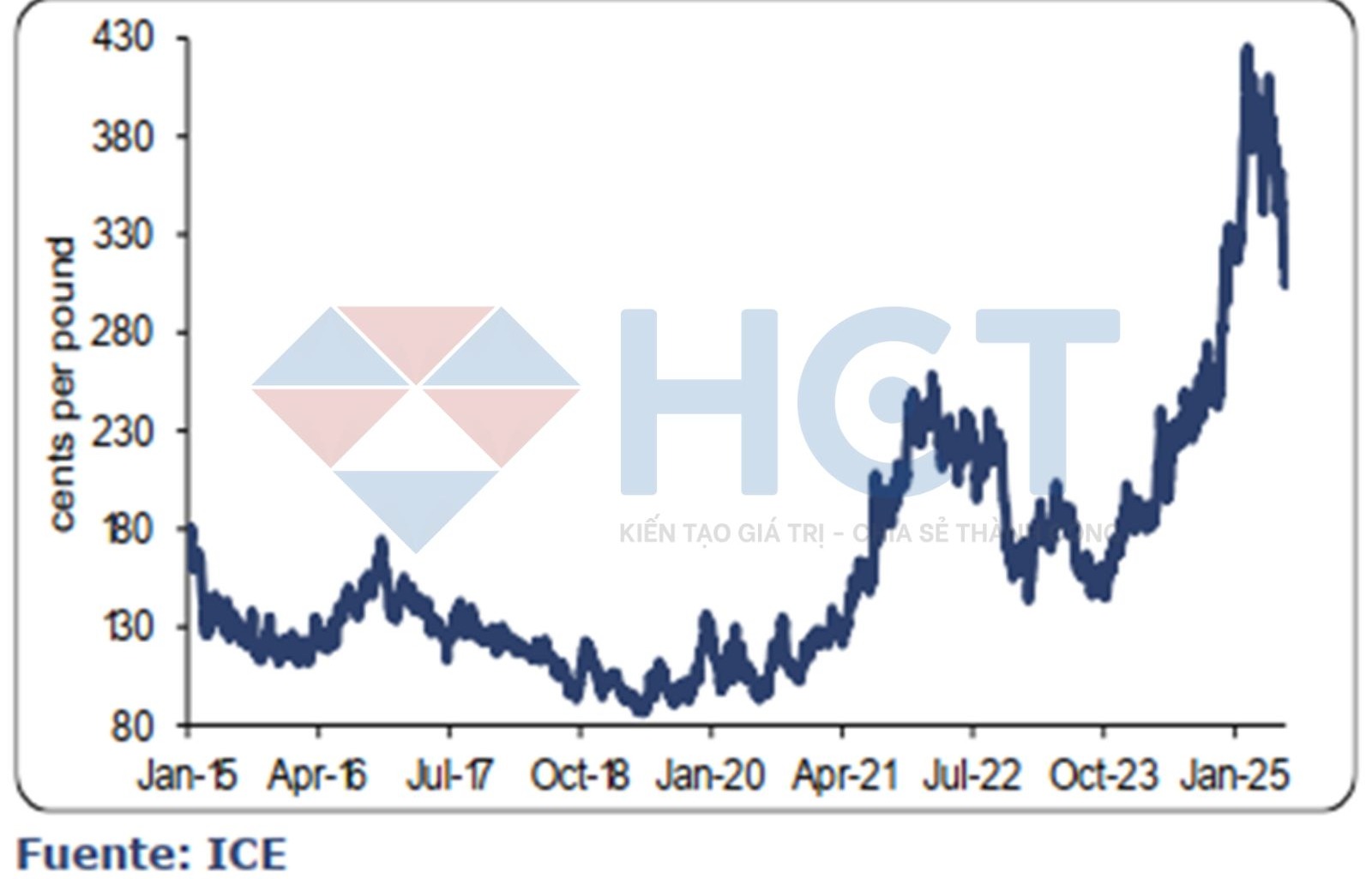 Thị trường cà phê Arabica trên Sàn giao dịch New York – Dài hạn: Mức độ điều chỉnh hiện tại cho thấy vùng đỉnh 429,95 nhiều khả năng là điểm kết thúc của xu hướng tăng và đánh dấu bước ngoặt sang xu hướng giảm trong dài hạn. Đáng chú ý, hợp đồng tháng 7 đã thiết lập mức cao mới tại 418,90, dù vẫn chưa vượt qua đỉnh lịch sử 429,95 được thiết lập vào tháng 2 bởi hợp đồng tháng 5 – hợp đồng hoạt động mạnh nhất tại thời điểm đó.