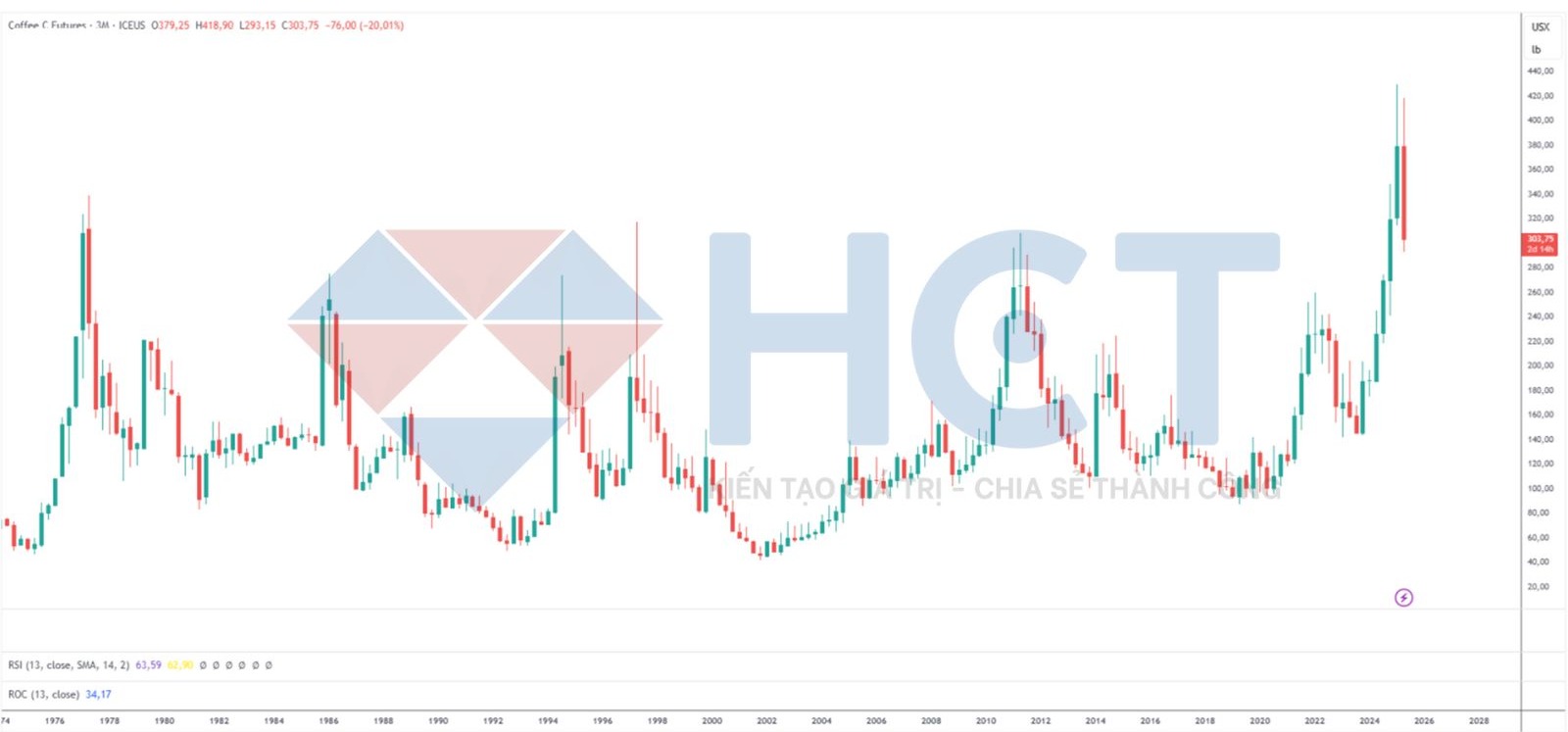 Thị trường cà phê Arabica trên Sàn giao dịch New York – Dài hạn: Mức độ điều chỉnh hiện tại cho thấy vùng đỉnh 429,95 có thể là sự kết thúc của xu hướng tăng và là điểm chuyển sang xu hướng giảm trong dài hạn. Đáng chú ý, hợp đồng tháng 7 đã đạt mức cao mới tại 418,90, dù vẫn chưa vượt qua mức đỉnh lịch sử 429,95 được thiết lập vào tháng 2 bởi hợp đồng tháng 5 – vốn là hợp đồng có thanh khoản cao nhất tại thời điểm đó.