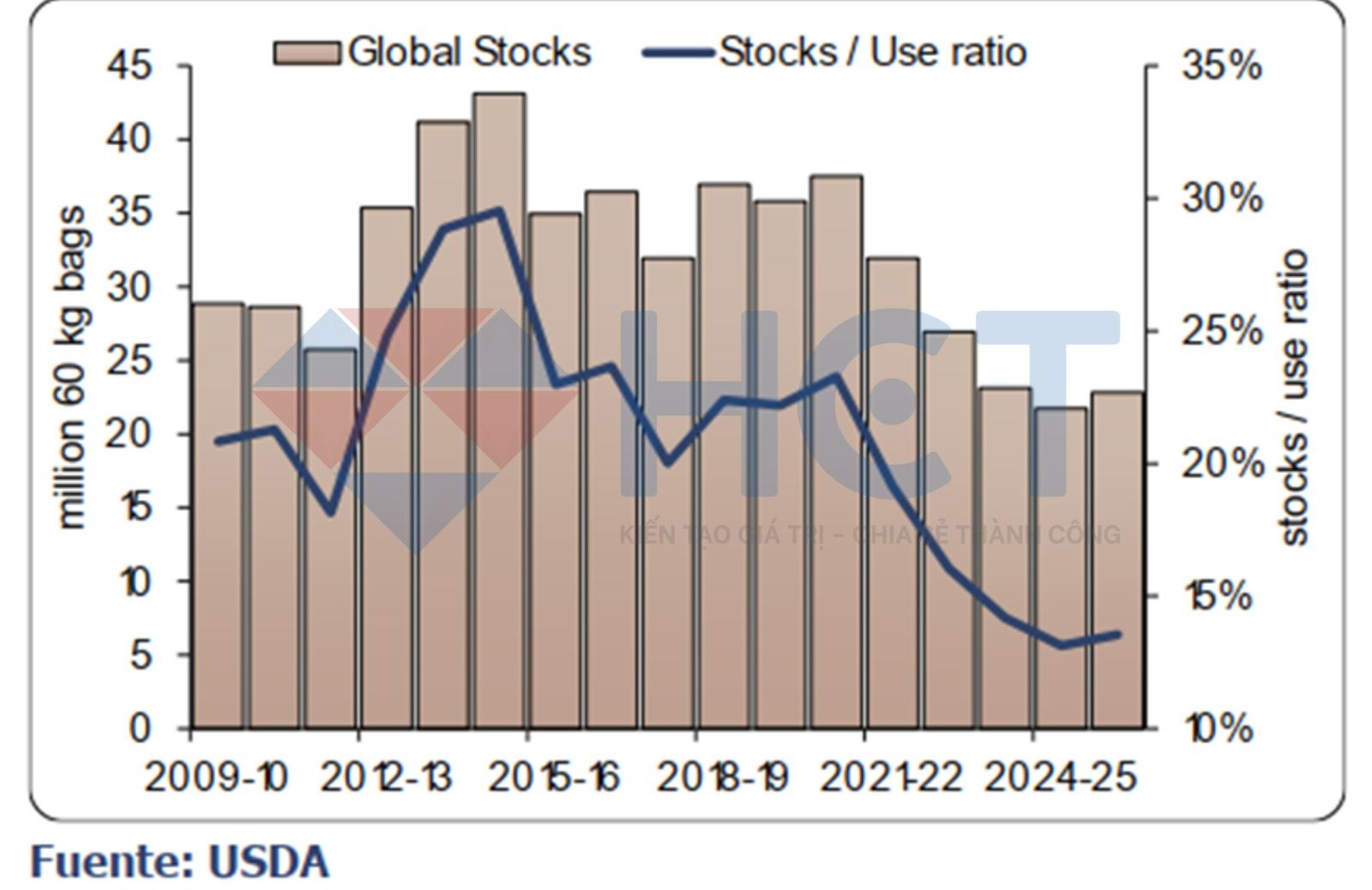 Tổng lượng tồn kho toàn cầu (bao gồm cả nhà sản xuất và tiêu dùng) dự kiến đạt 22,819 triệu bao trong niên vụ 2025/26, nhích lên từ mức rất thấp 21,752 triệu bao trong niên vụ hiện tại. Mặc dù vẫn còn ở mức hạn chế, việc tồn kho không tiếp tục sụt giảm được xem là yếu tố có tính chất quan trọng đối với triển vọng thị trường – giảm bớt lo ngại thắt chặt nguồn cung nghiêm trọng trong ngắn hạn.