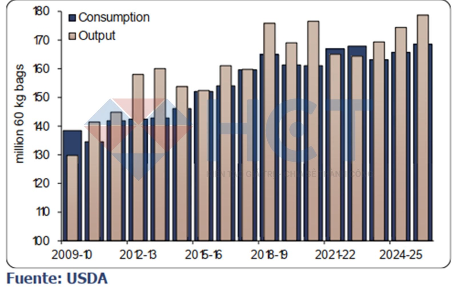 Với sản lượng toàn cầu dự kiến đạt 178,68 triệu bao trong niên vụ 2025/26, mức này sẽ vượt qua kỷ lục trước đó là 176,549 triệu bao được ghi nhận trong niên vụ 2020/21. Điều này tiếp tục củng cố nhận định rằng áp lực nguồn cung trong trung hạn sẽ dịu lại, qua đó tạo thêm yếu tố duy trì xu hướng giá giảm trong thời gian tới.