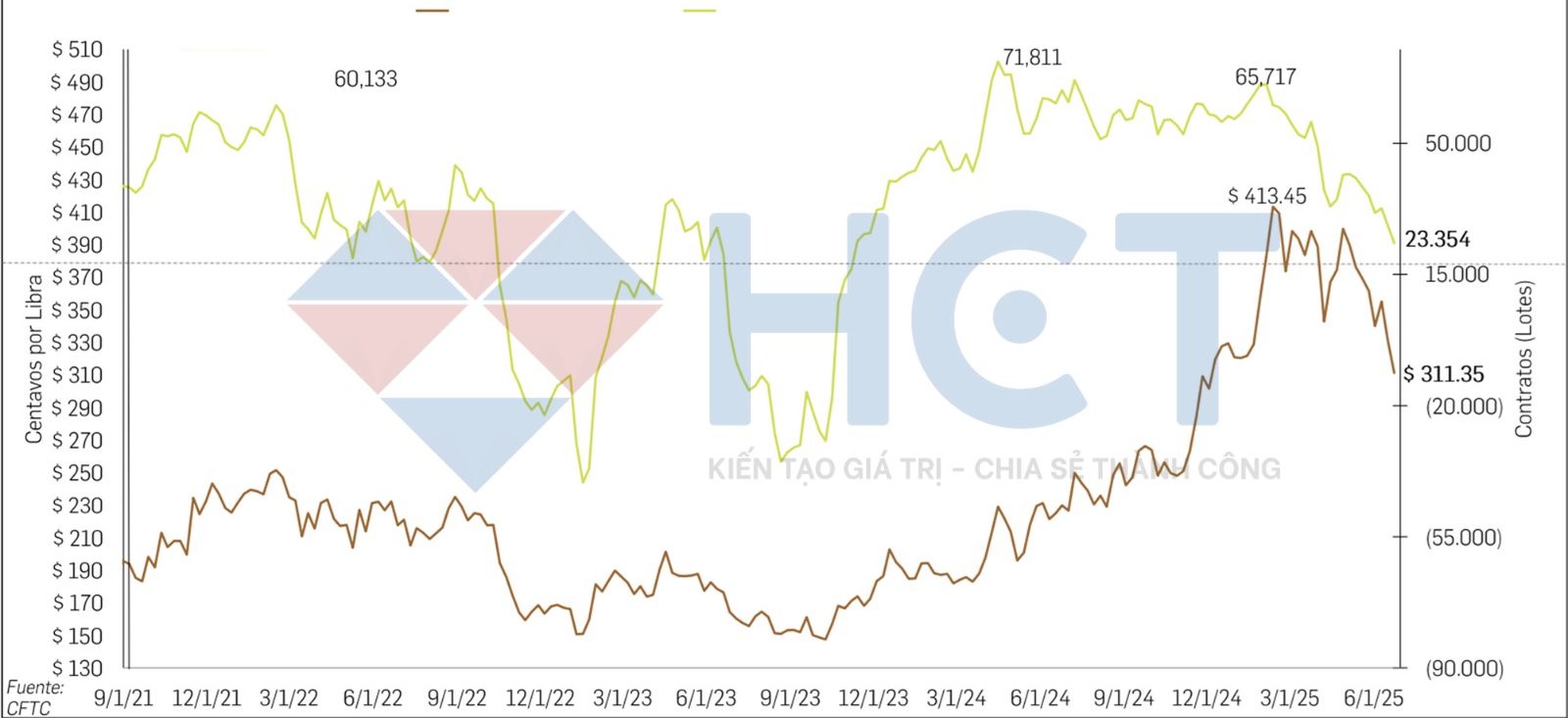 Thị trường cà phê Arabica trên Sàn giao dịch New York: Với đợt điều chỉnh giá gần đây, vị thế mua ròng của các nhà đầu cơ – vốn ở mức khá cao – đã giảm đáng kể, xác nhận rõ sự chuyển đổi xu hướng dài hạn sang xu hướng giảm. Tuy nhiên, trong ngắn và trung hạn vẫn có thể xuất hiện các nhịp điều chỉnh tăng tạm thời trong xu hướng này.
