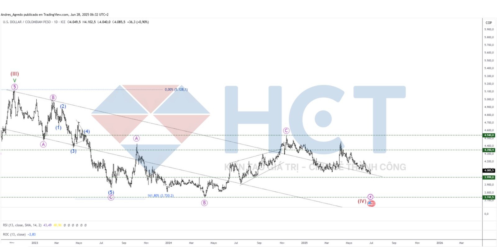 Tỷ giá USD/Peso Colombia - Trung và Dài Hạn: Thị trường tiếp tục chịu áp lực giảm. Sẽ cần theo dõi thêm trong vài ngày tới để có cái nhìn rõ hơn về xu hướng trung hạn.