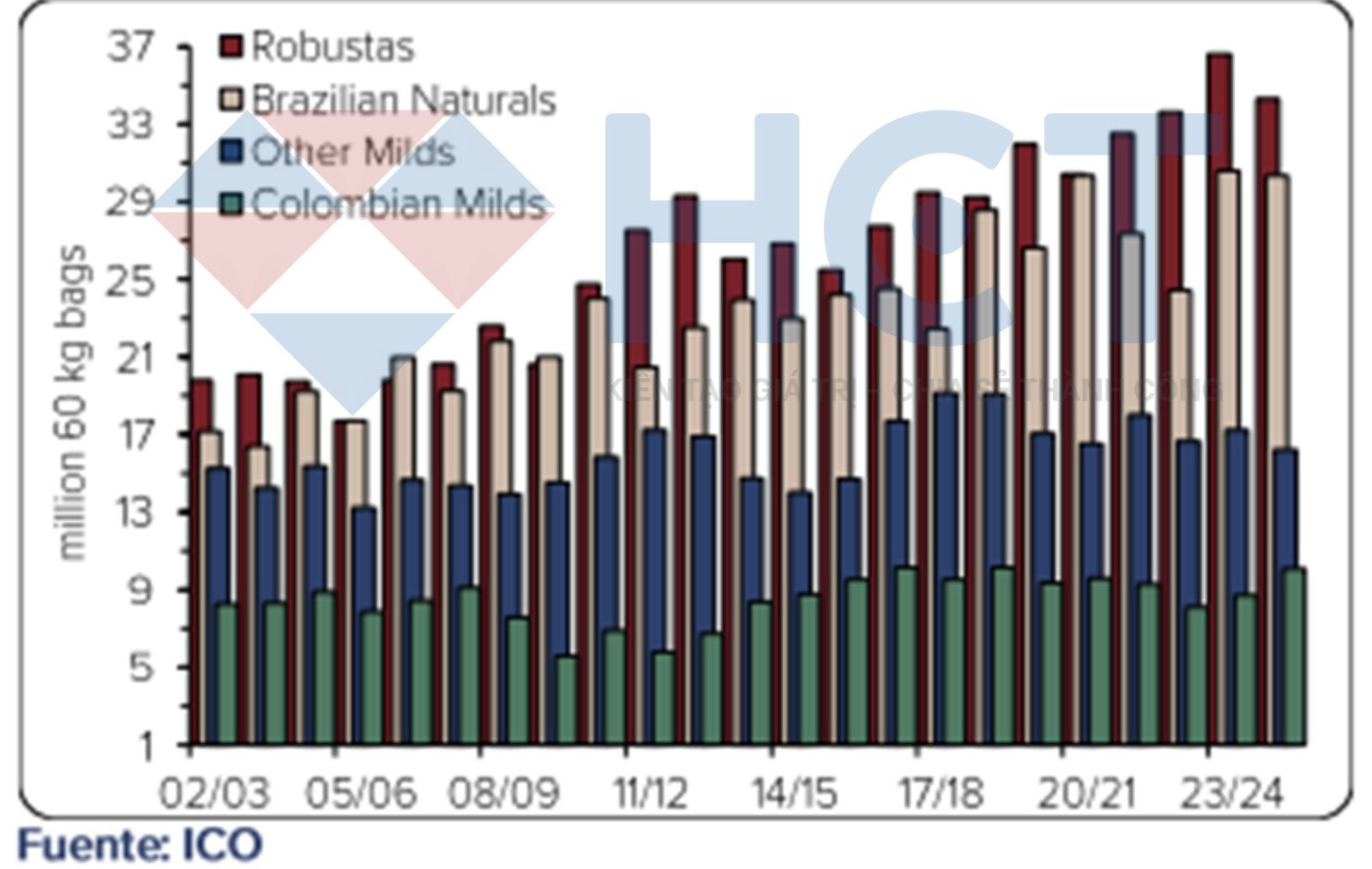 Tình hình này cũng có thể được hiểu rằng năm ngoái Brazil đã lấp đầy khoảng trống sản lượng của các quốc gia khác, nhưng ở thời điểm hiện tại, khi sản xuất tại nhiều nước đã dần phục hồi, thị trường không còn phụ thuộc nhiều vào nguồn cung từ Brazil. Trong niên vụ tới, dự kiến sản lượng sẽ tiếp tục tăng, giúp mở rộng nguồn cung toàn cầu và giảm áp lực lên Brazil trong việc duy trì xuất khẩu khối lượng lớn một cách liên tục.