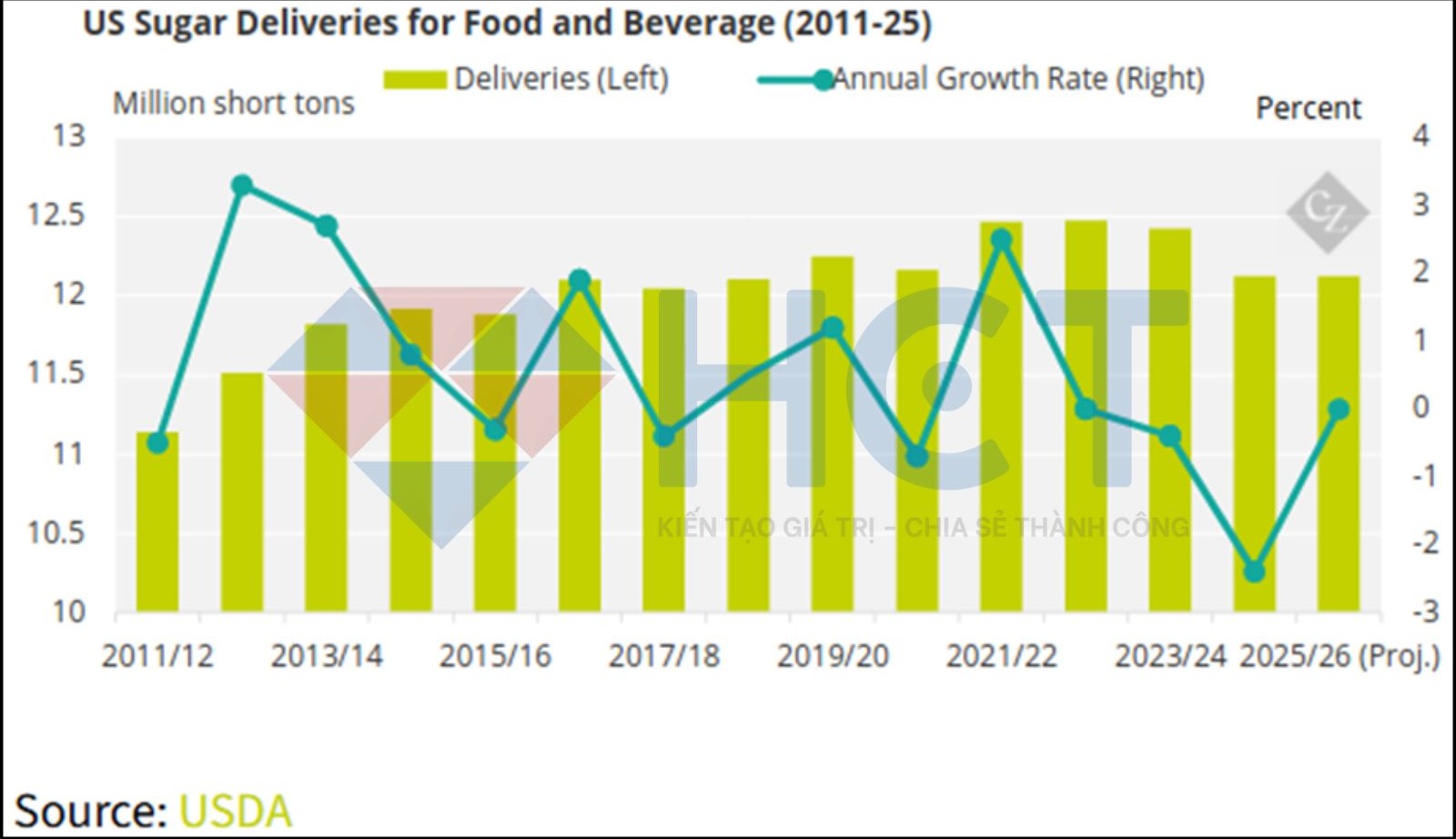 Lo ngại về nhu cầu tiêu thụ đường được thể hiện rõ trong Báo cáo Dữ liệu Thị trường Chất làm ngọt (SMD) tháng 6 của USDA, cho thấy lượng đường giao trong tháng 4 để phục vụ tiêu dùng giảm 6% so với cùng kỳ năm trước, đảo chiều so với mức tăng 1,8% ghi nhận trong tháng 3. Tính chung giai đoạn từ tháng 10 đến tháng 4, tổng lượng giao đường giảm 3,1% so với cùng kỳ niên vụ trước.