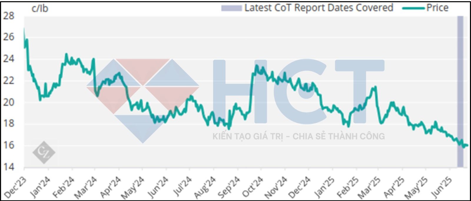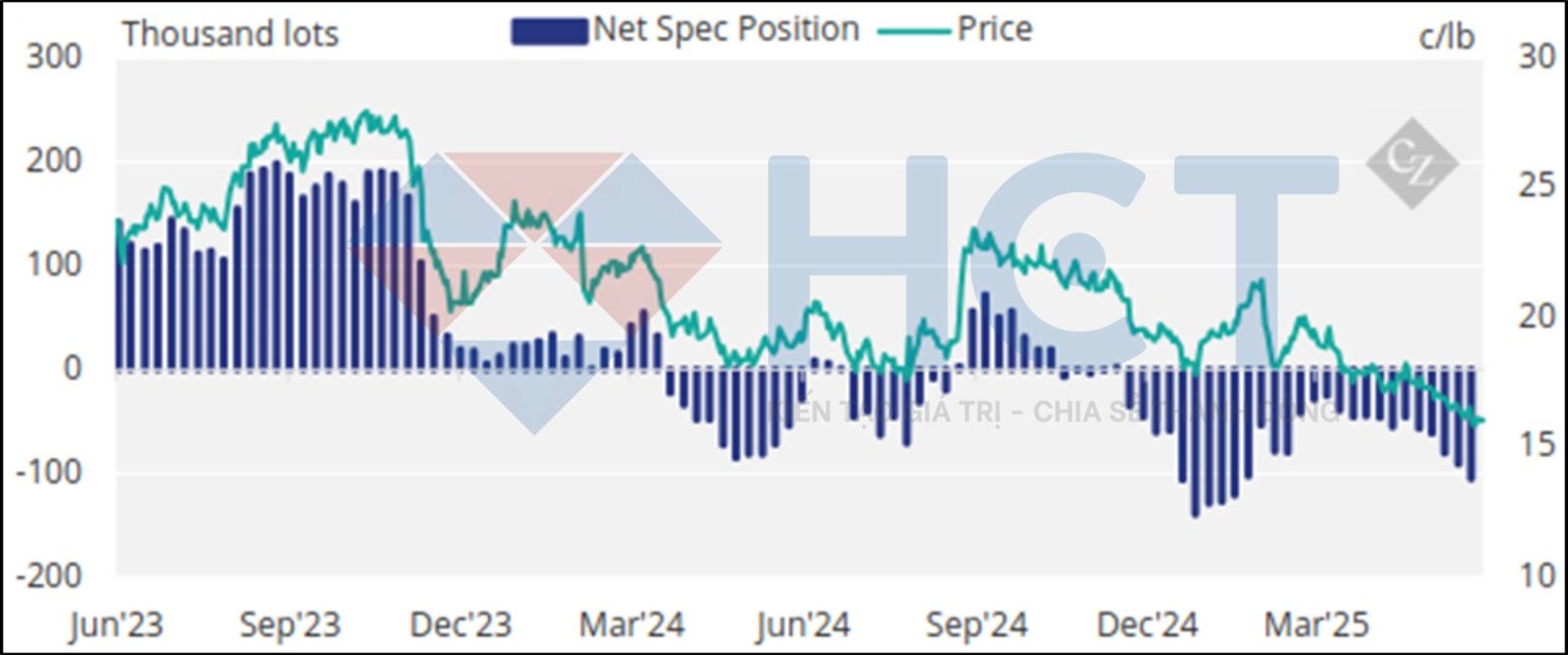 Đáng chú ý, các nhà đầu cơ đang giữ vị thế bán ròng lớn (-105.200 hợp đồng), với lượng vị thế mua bị cắt giảm hơn 10.000 hợp đồng và vị thế bán được tăng thêm gần 4.000 hợp đồng. Điều này phản ánh rõ tâm lý bi quan ngắn hạn đối với giá đường.