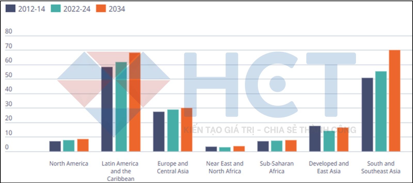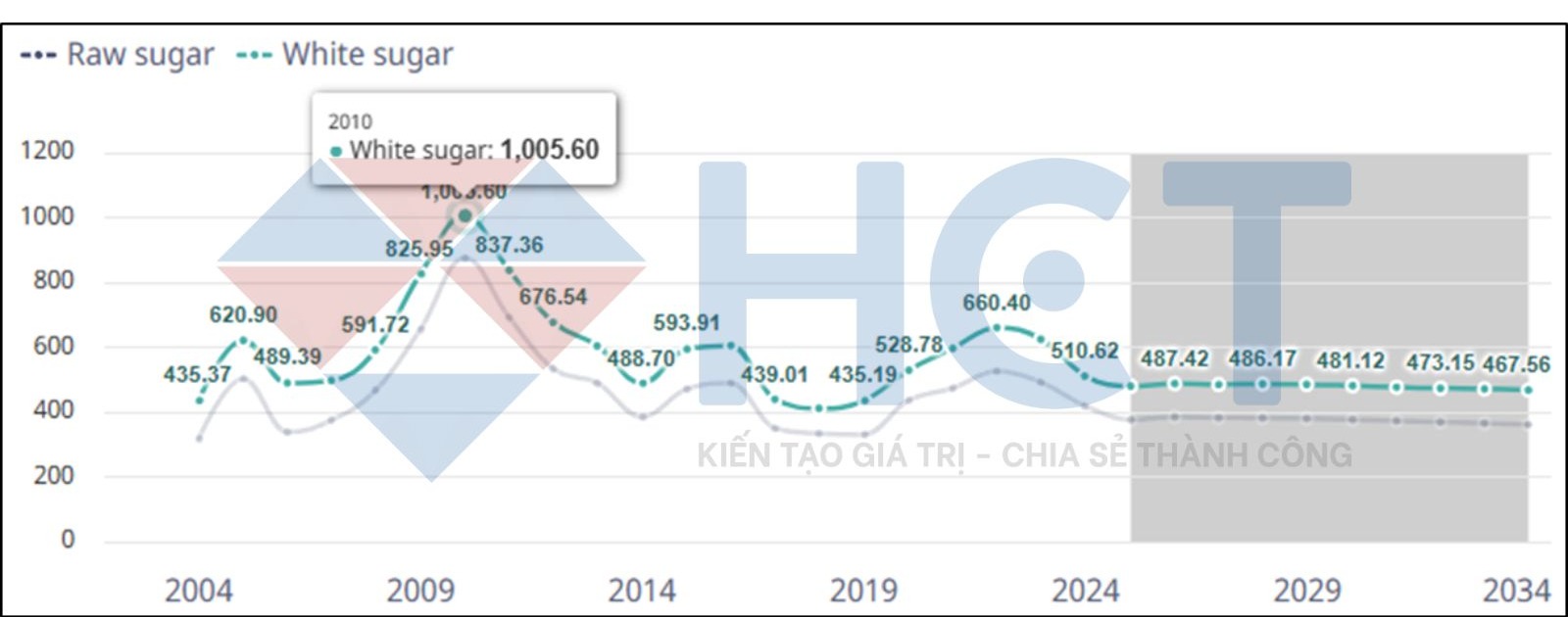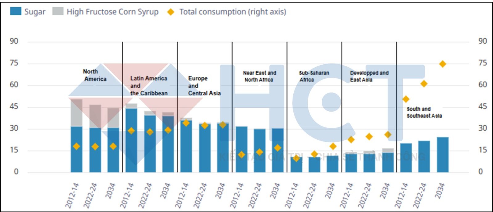 Nhu cầu tiêu thụ đường trên toàn cầu dự kiến tiếp tục tăng trưởng trung bình khoảng 1.2% mỗi năm trong giai đoạn 2025-2034, đạt mức 202 triệu tấn vào cuối giai đoạn này. Sự gia tăng này chủ yếu đến từ các nước có thu nhập thấp và trung bình tại châu Á và châu Phi, nơi dân số tăng nhanh và mức sống được cải thiện rõ rệt, kéo theo nhu cầu tiêu dùng đường tăng theo.