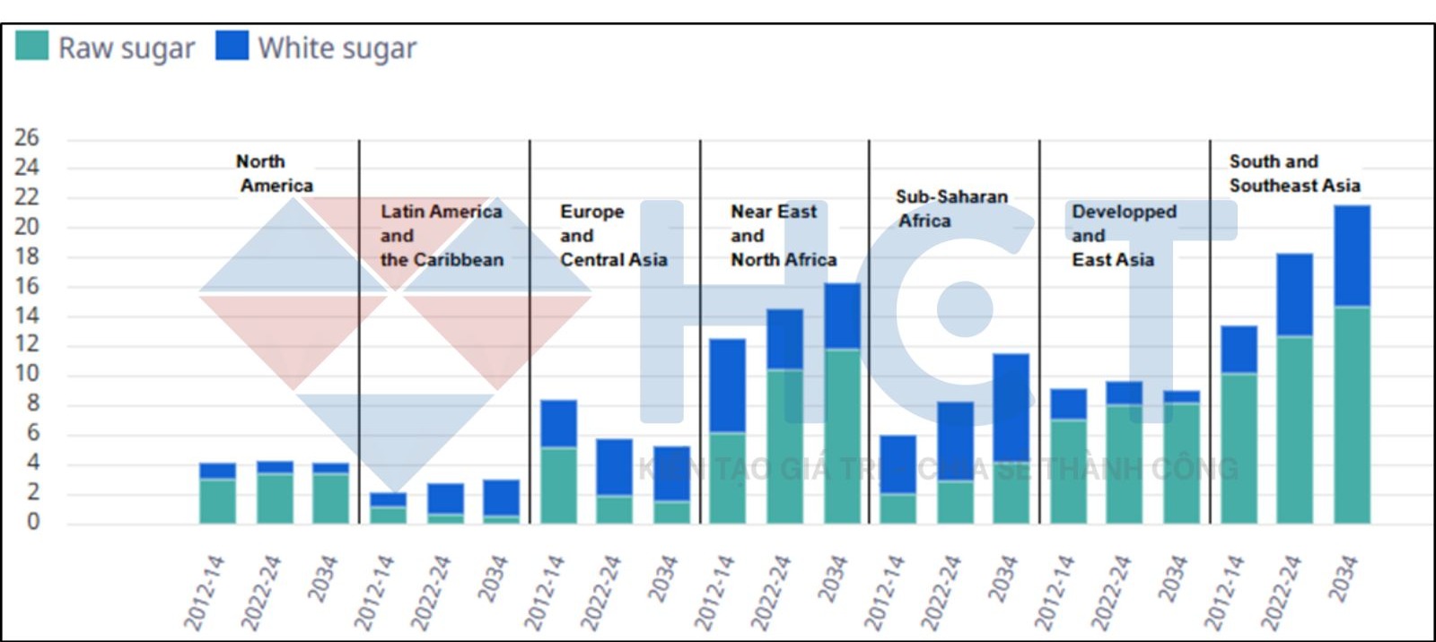 Đặc biệt, châu Á dự báo sẽ trở thành khu vực sản xuất đường lớn nhất thế giới, chiếm khoảng 42% tổng sản lượng, phản ánh sự phát triển mạnh mẽ của các quốc gia sản xuất lớn trong khu vực này. Ngoài ra, sản xuất đường củ cải dự kiến giữ mức ổn định hoặc tăng nhẹ ở một số quốc gia như Liên minh châu Âu và Nga, chủ yếu nhờ những đổi mới nông nghiệp và chính sách hỗ trợ của chính phủ.