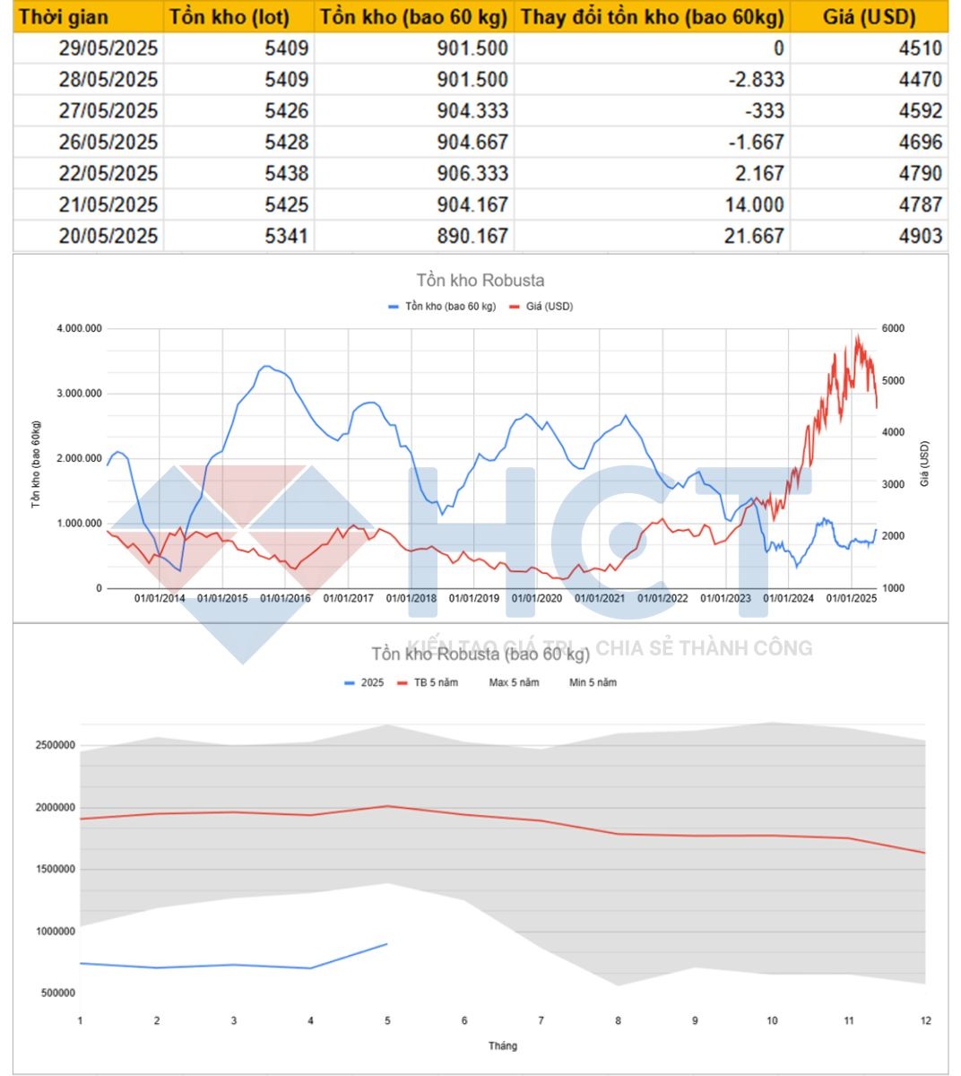 Giá Robusta từng bật tăng lên mức cao 4.790 USD vào ngày 22/05. Tuy nhiên, sau khi thị trường hấp thụ lượng tồn kho tăng mạnh, giá bắt đầu giảm nhanh: