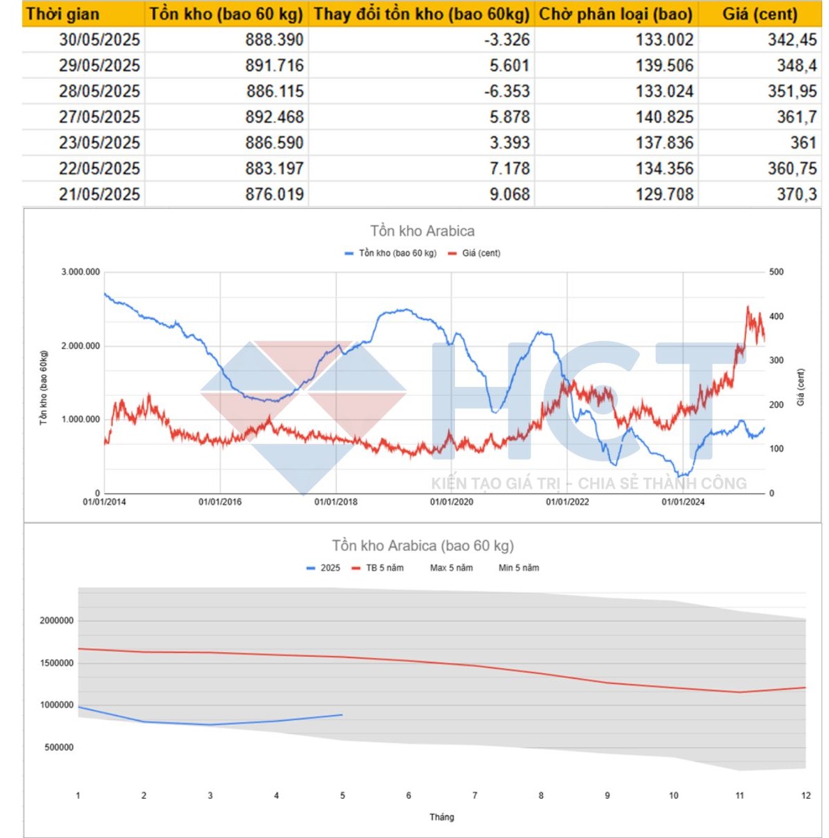 Giá Arabica mở đầu tuần ở mức 361 cent (23/05) nhưng liên tục chịu áp lực giảm khi tồn kho duy trì xu hướng tăng nhẹ và lượng hàng chờ phân loại duy trì quanh mức >130.000 bao.