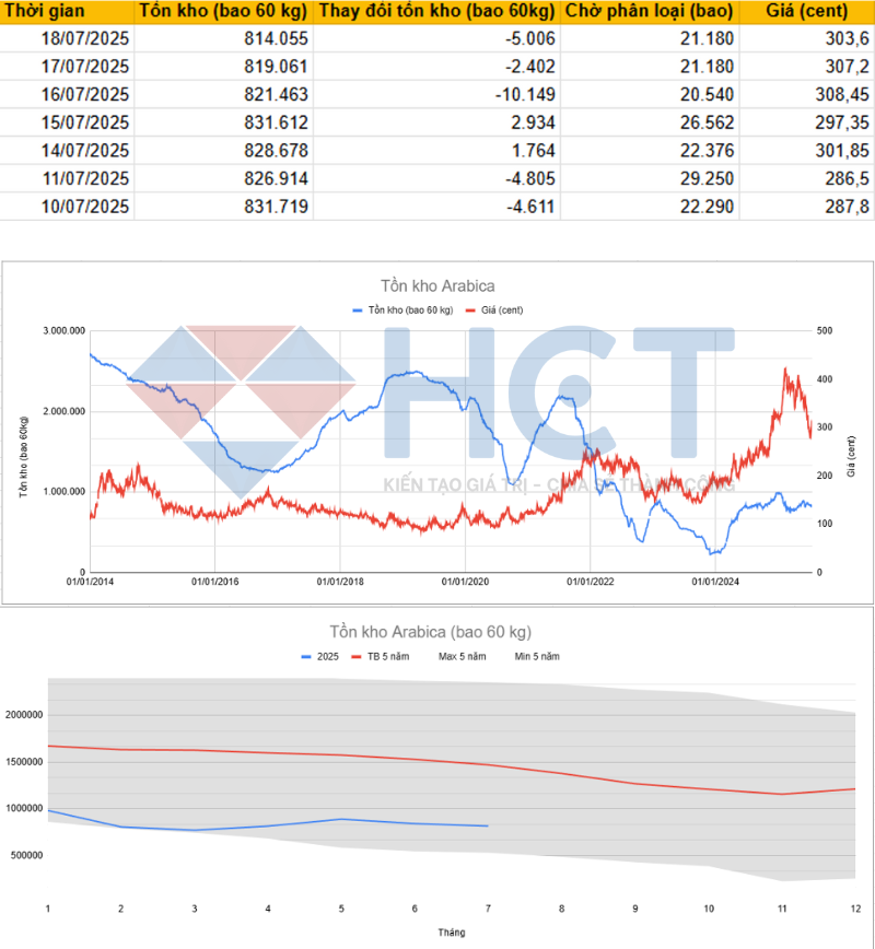 Trong tuần từ 10/07 đến 18/07/2025, tồn kho Arabica có xu hướng giảm nhẹ trở lại sau một vài phiên tăng xen kẽ: