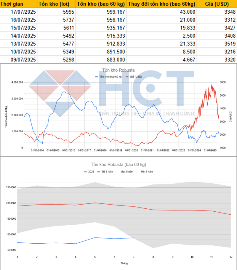 Từ ngày 13 đến 16/07/2025, tồn kho Robusta duy trì đà tăng liên tục 4 phiên liền, với tốc độ tăng dần đều: