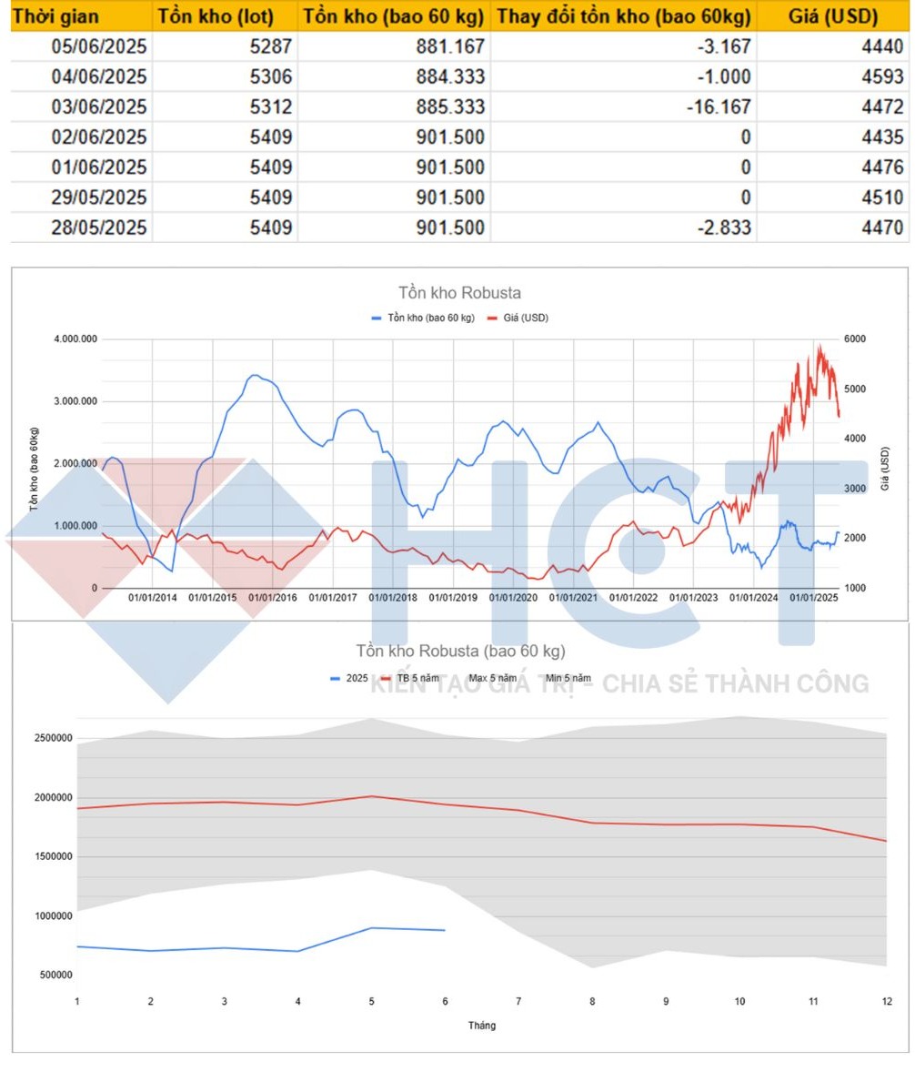 Dù tồn kho giảm mạnh, nhưng giá Robusta vẫn chưa thể phục hồi vững chắc, thể hiện tâm lý thị trường vẫn còn thận trọng: