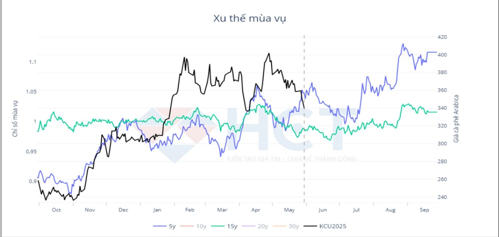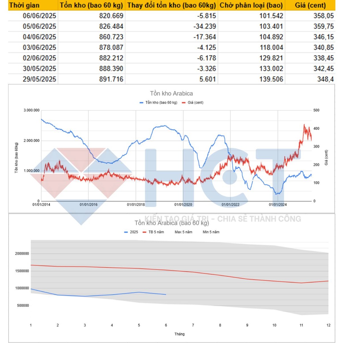 Trái ngược với tuần trước, khi tồn kho tăng nhẹ và giá giảm, tuần này giá Arabica phục hồi từ 348,4 cent (29/05) lên 358,05 cent (06/06) – tức tăng gần +10 cent so với đầu tuần, và hơn +18 cent từ đáy ngày 02/06 (338,45 cent).