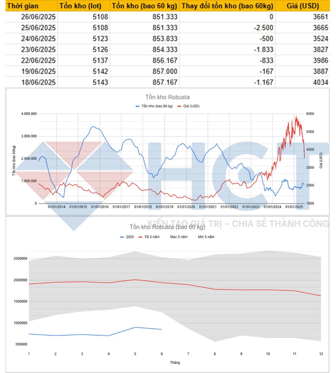 → Tổng cộng rút ra hơn -4.833 bao chỉ trong 3 ngày, đưa lượng tồn kho Robusta về 851.333 bao (tương đương 5.108 lot) – mức thấp nhất kể từ đầu tháng 6.