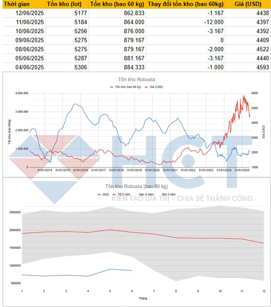 Sau chuỗi ngày gần như không đổi trong giai đoạn từ 08/06 đến 10/06 (giữ vững quanh mức 879.167–876.000 bao), tồn kho Robusta tại ICE EU đã giảm tổng cộng 21.500 bao chỉ trong 3 phiên giao dịch gần nhất: